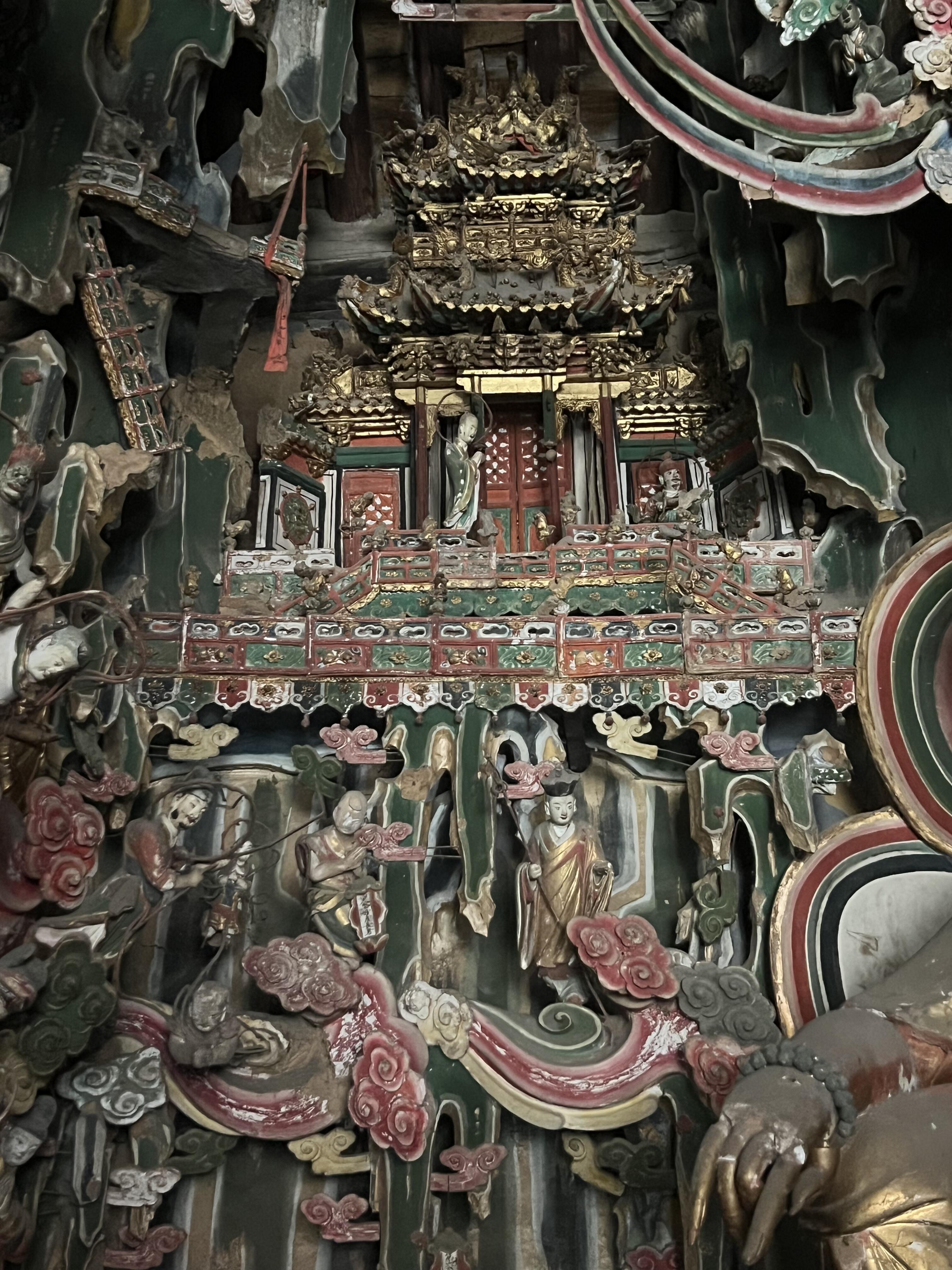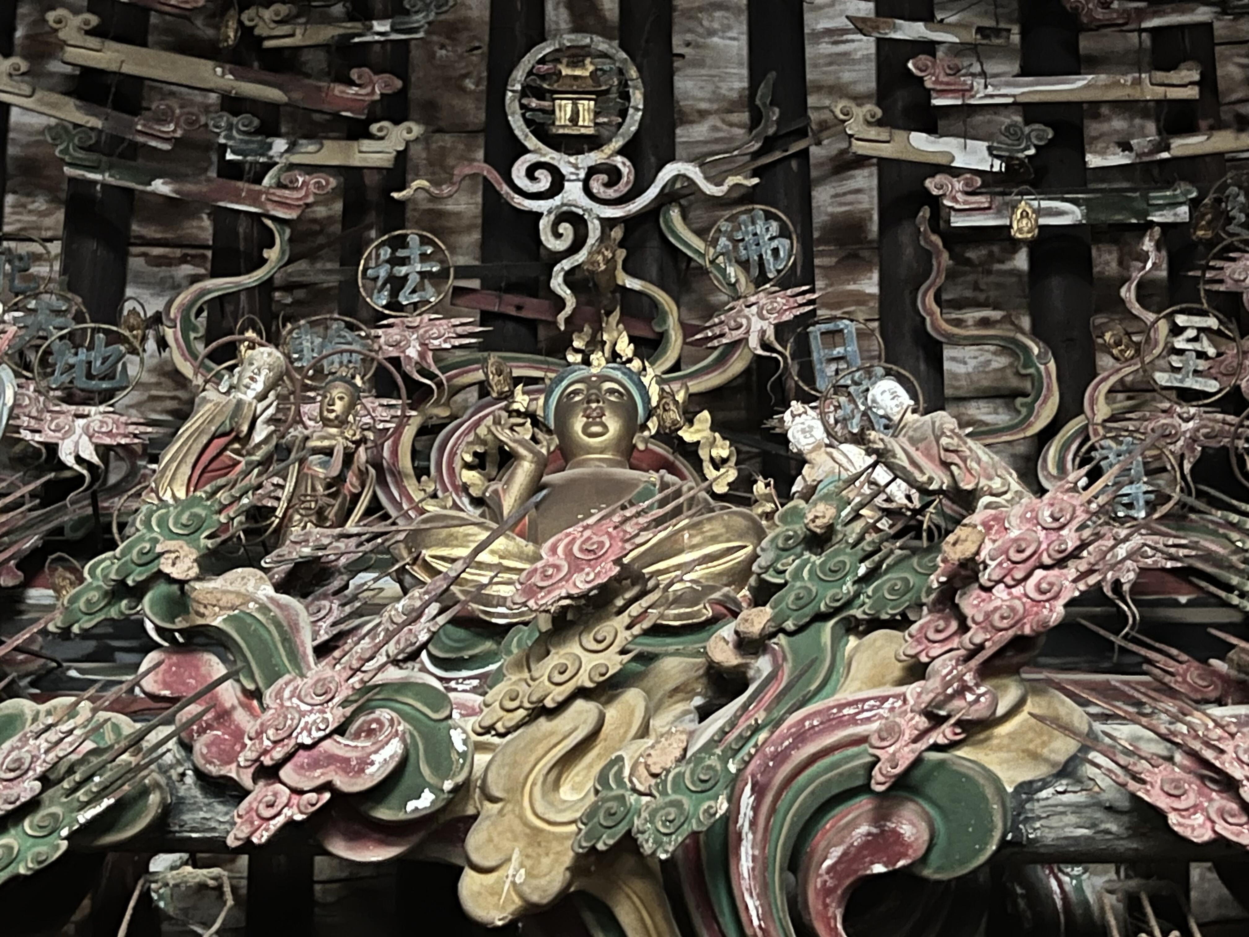 殿内没有多余的灯光,只有几扇高窗把天光切成细条,恰好落在满殿的悬塑上。抬头的瞬间,我甚至忘了呼吸——从屋顶垂落的祥云里藏着飘带翻飞的飞天,两米多高的观音像手托净瓶,衣褶里还嵌着米粒大的童子,而角落里最小的塑像连两厘米都不到,却能看清眉眼间的神态。五百多尊塑像层层叠叠,大到佛、菩萨,小到伎乐、侍从,连祥云的卷边、衣袂的褶皱都刻得一丝不苟,明明是泥塑的身躯,却像下一秒就要踏着祥云飘出殿外。