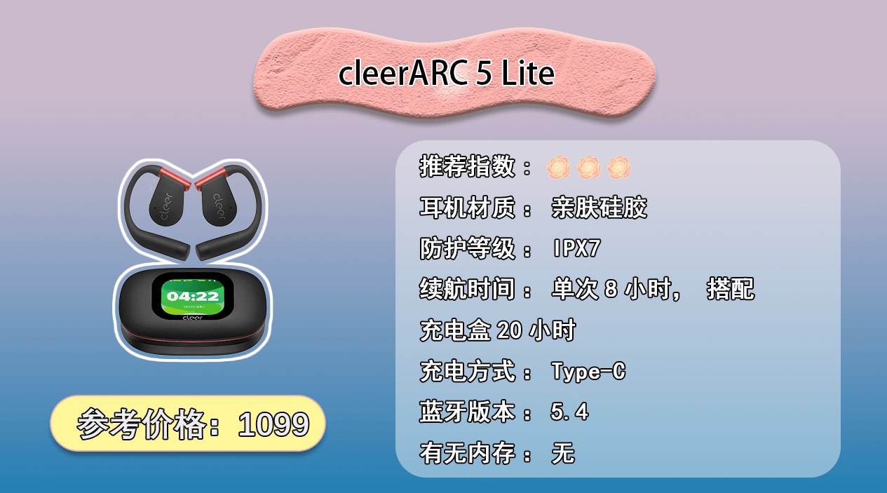 cleer ARC 5 Lite是一款面向运动与日常通勤的开放式挂耳耳机,主打舒适佩戴与沉浸音效。它采用开放式设计,无需入耳即可稳固贴合,长时间佩戴透气轻盈,跑步、骑行时既能享受音乐,又能保持对环境声的感知,提升安全性。
