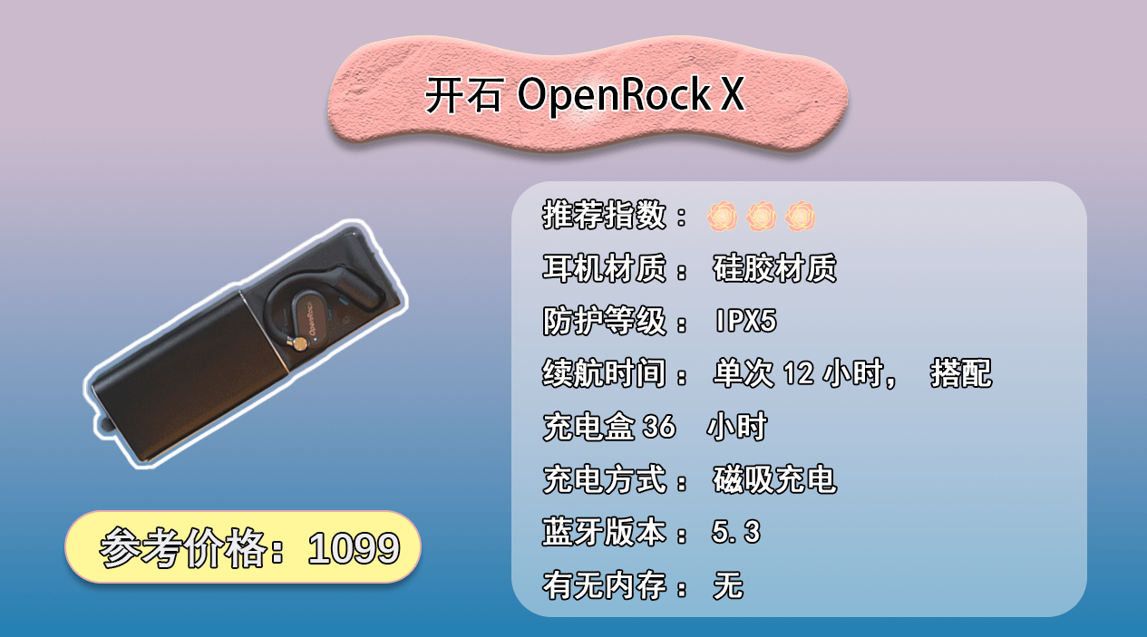 开石OpenRock X是一款高端开放式气传导运动耳机,专为跑步、骑行等长时间佩戴场景设计。它针对传统骨传导耳机音质单薄、漏音严重的痛点,采用自研TubeBass™低频增强与BassDirect™低音聚能腔体技术,配合14.2mm大动圈单元,低频下潜更深,中高频清晰自然,整体音质表现接近入耳式耳机水准。