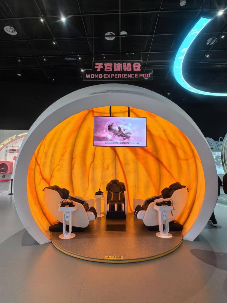 走进面积最大的“微中有机”主题展厅,一个名为“子宫体验仓”的装置格外引人注目。坐进仓中特制的座椅,戴上VR设备,观展者仿佛瞬间回到生命之初——耳边是母亲体内血液流动的声音,眼前是羊水中漂浮的光影,身体感受着被温暖包裹的触觉。这是受精卵历经重重阻碍找到卵子的亿万分之一奇迹,是从芝麻粒大小的胚胎逐渐发育成婴孩的十个月旅程。