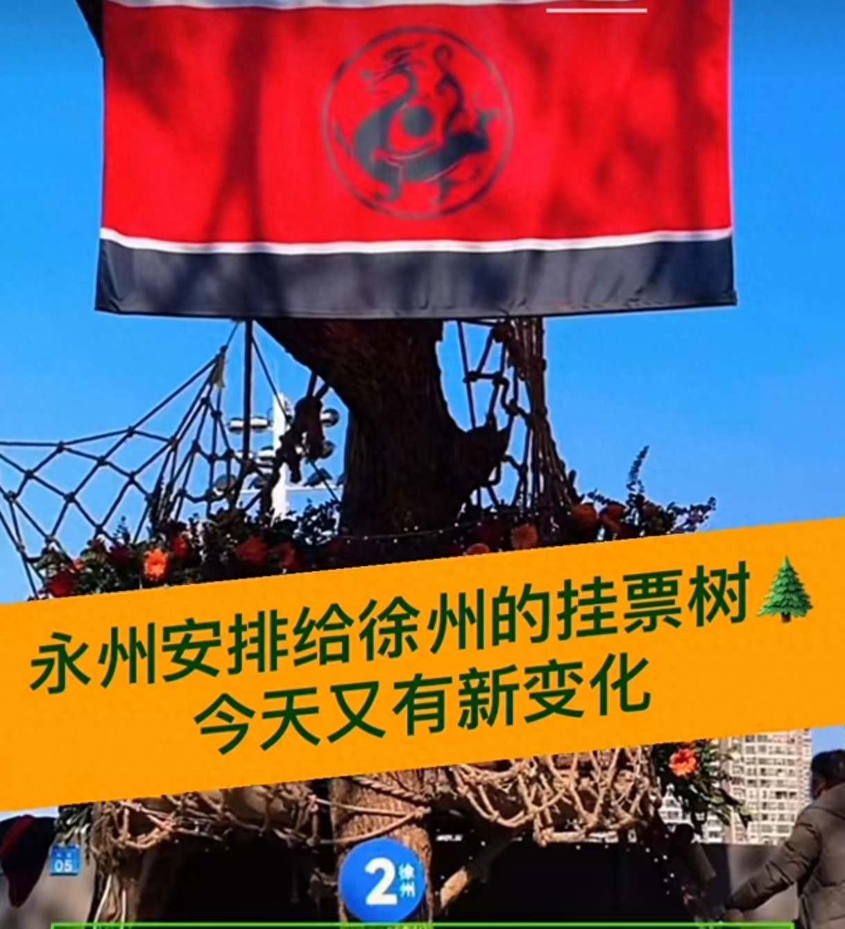 这事说起来也简单,前段时间永州体育场给江苏十三太保各分了棵树当“挂票树”,原本就是方便外地游客打卡的小设计,谁成想直接勾出了江苏网友的城市荣誉感。徐州人最先动手,给树来了波“汉风改造”:红底黑纹的汉旗往树干上一挂,旗面的龙纹透着两汉的厚重。