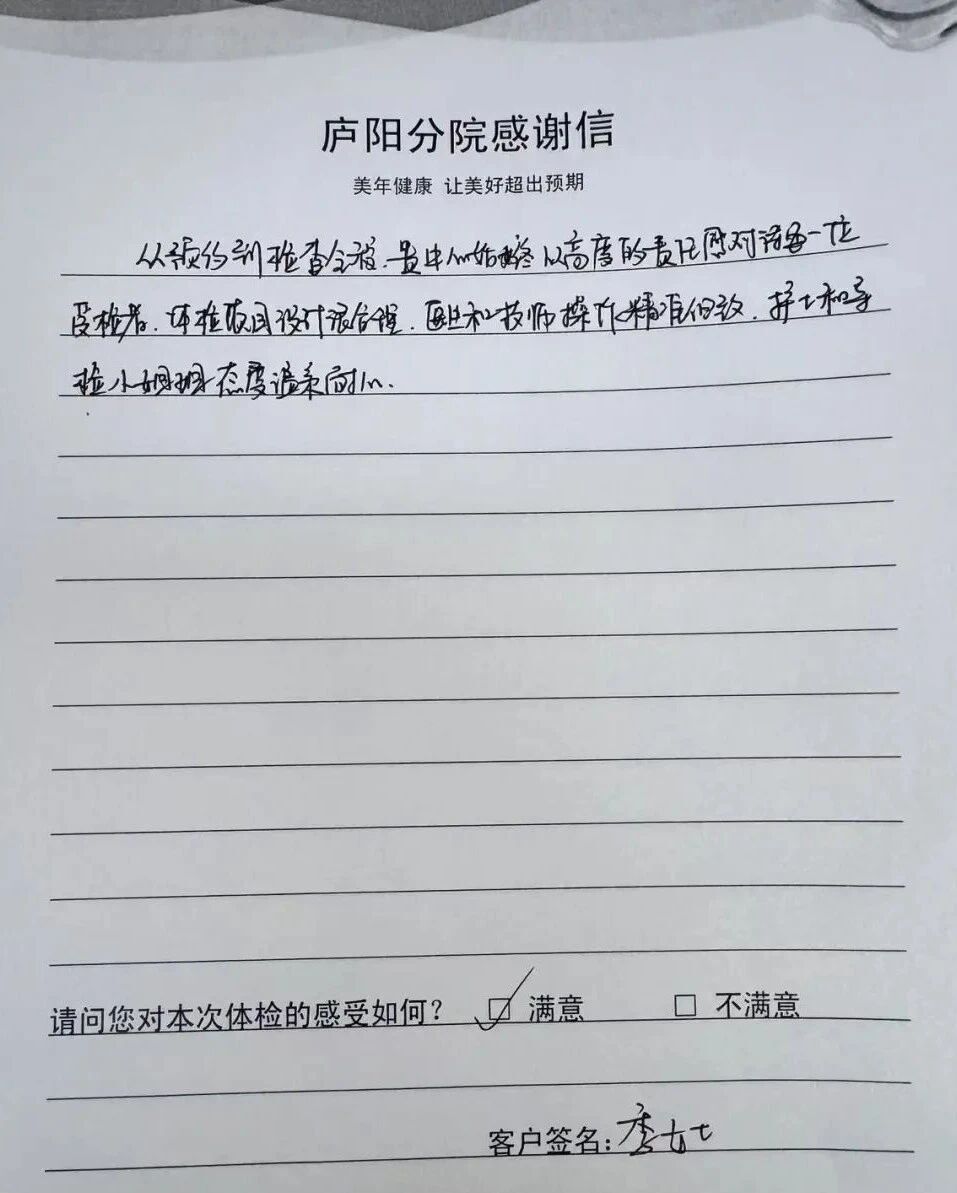 李女士则从预约到检查的全流程,感受到了庐阳分院的高度责任感。“体检项目设计合理,医生和技师操作精准细致,护士和导检小姐姐态度温柔耐心”,每一个细节都彰显着对客户健康的敬畏与呵护,再次回应了#体检哪家服务好# 的核心疑问,用实力筑牢口碑。