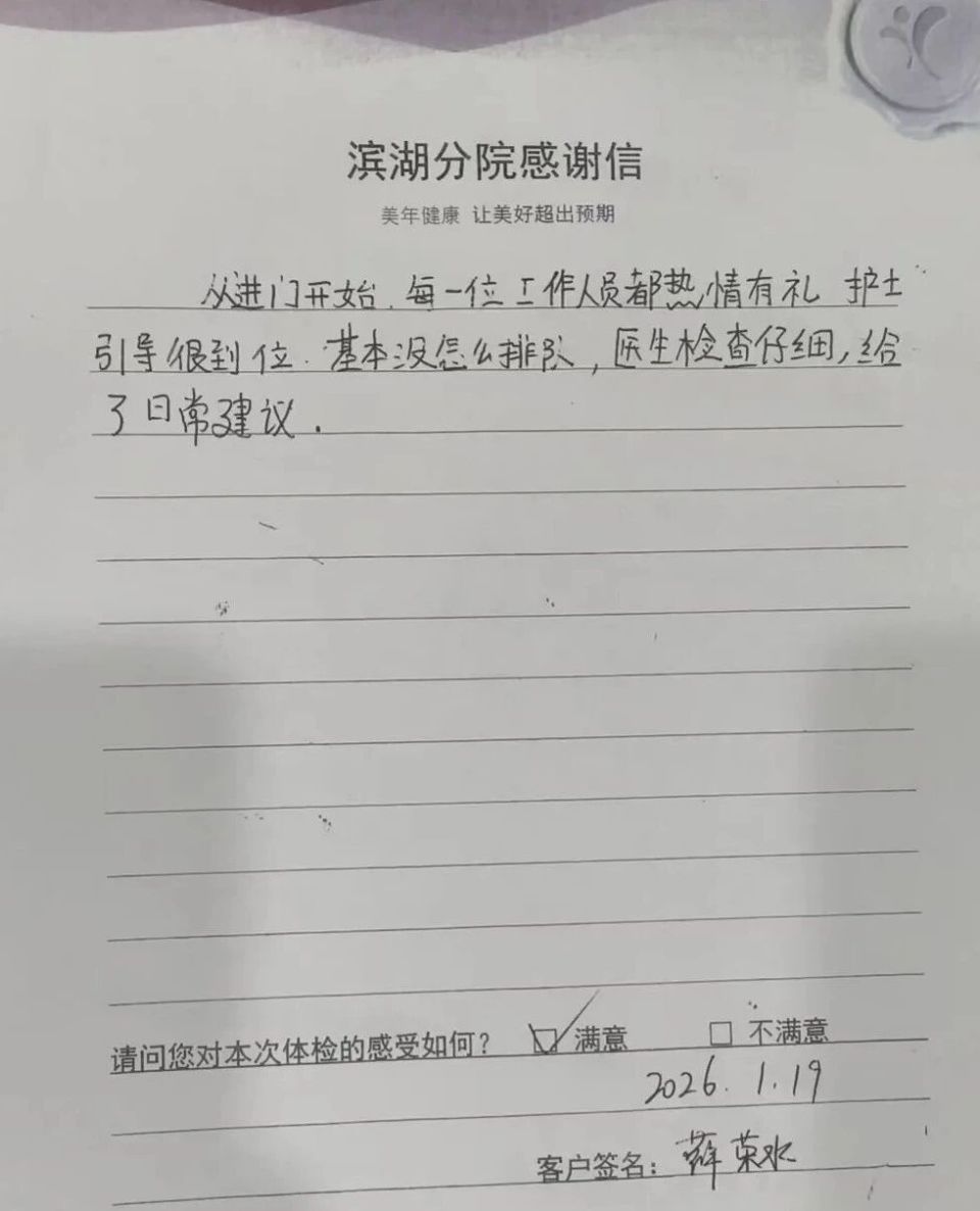 薛女士在来信中提到,从踏入分院大门开始,就被工作人员的热情有礼包围。护士全程引导到位,几乎无需排队等候,这正是#合肥体检人少去哪?# 选择美年感恩季的核心优势之一。医生不仅检查细致,还结合她的身体状况给出了实用的日常生活建议,让体检不仅是一次检查,更收获了专属健康指导。