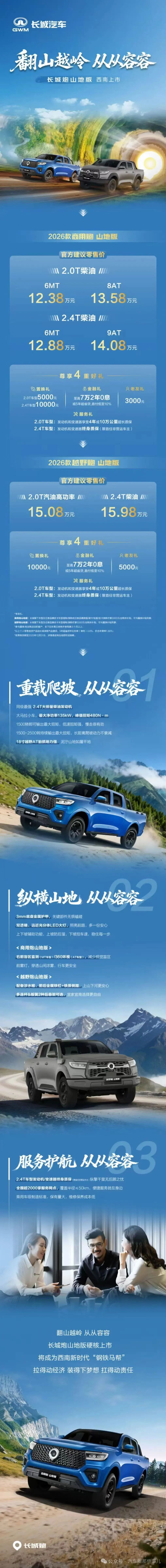 2025年12月2日,长城炮山地版正式上市。商用炮山地版的起步价定在12.38万元,越野炮山地版则从15.08万元起售。该车最大的亮点是搭载了前后铁保险杠、铁质踏板以及金属底盘护板,进一步强化越野能力。
