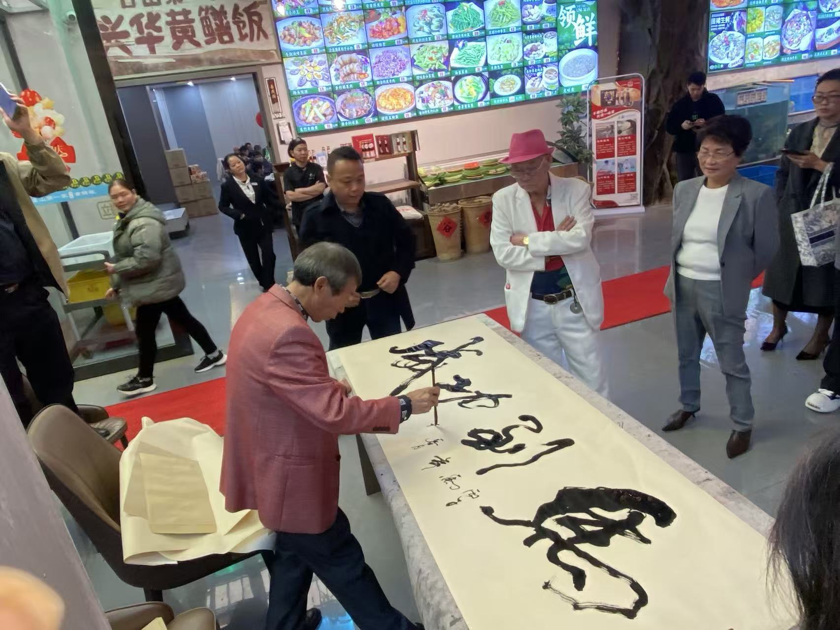 著名书法家冯才基先生在现场即席挥毫,只见他凝神静气,提笔蘸墨,宣纸铺展,写下了“马到功成”,“精气神”、“黄鳝公”、“黄鳝婆”等几个大字。冯才基先生书法字体遒劲有力,笔划如游龙,好评如潮。