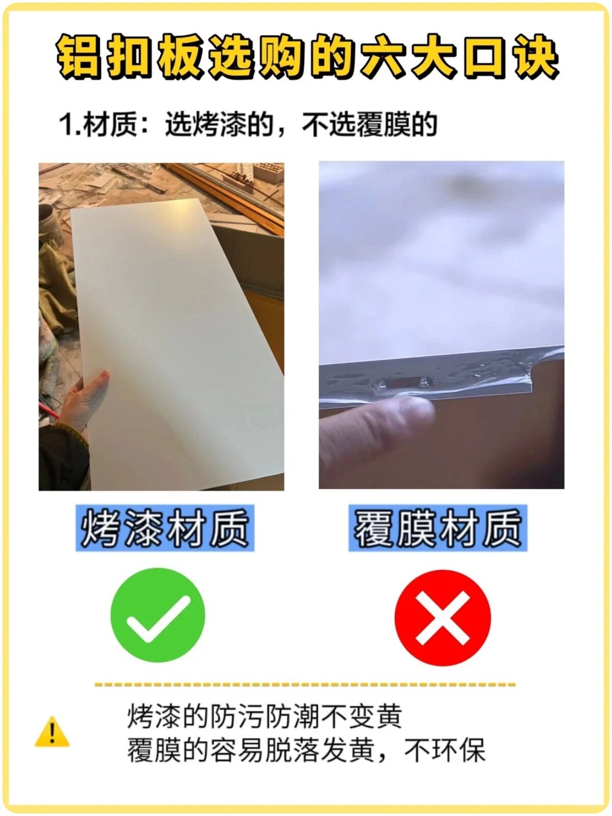 测试方法:用打火机烧铝扣板表面,能擦掉是烤漆的,烧黑擦不掉并且带有胶味是覆膜的。