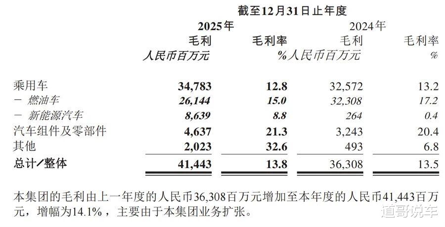 财报数据显示,2025年奇瑞汽车乘用车毛利率为12.8%,低于上年的13.2%。公告解释称,这主要是由于利润率相对较低的新能源汽车收入占比提升,以及市场竞争加剧所致。也就是说,新能源汽车占比增长,一定程度上稀释了奇瑞汽车毛利率。