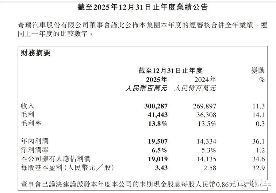 财报数据显示,2025年,奇瑞汽车全年实现总营收3002.9亿元,同比增长11.3%;净利润195.1亿元,同比增长36.1%;净利润率从5.3%提升至6.5%,盈利能力持续增强。
