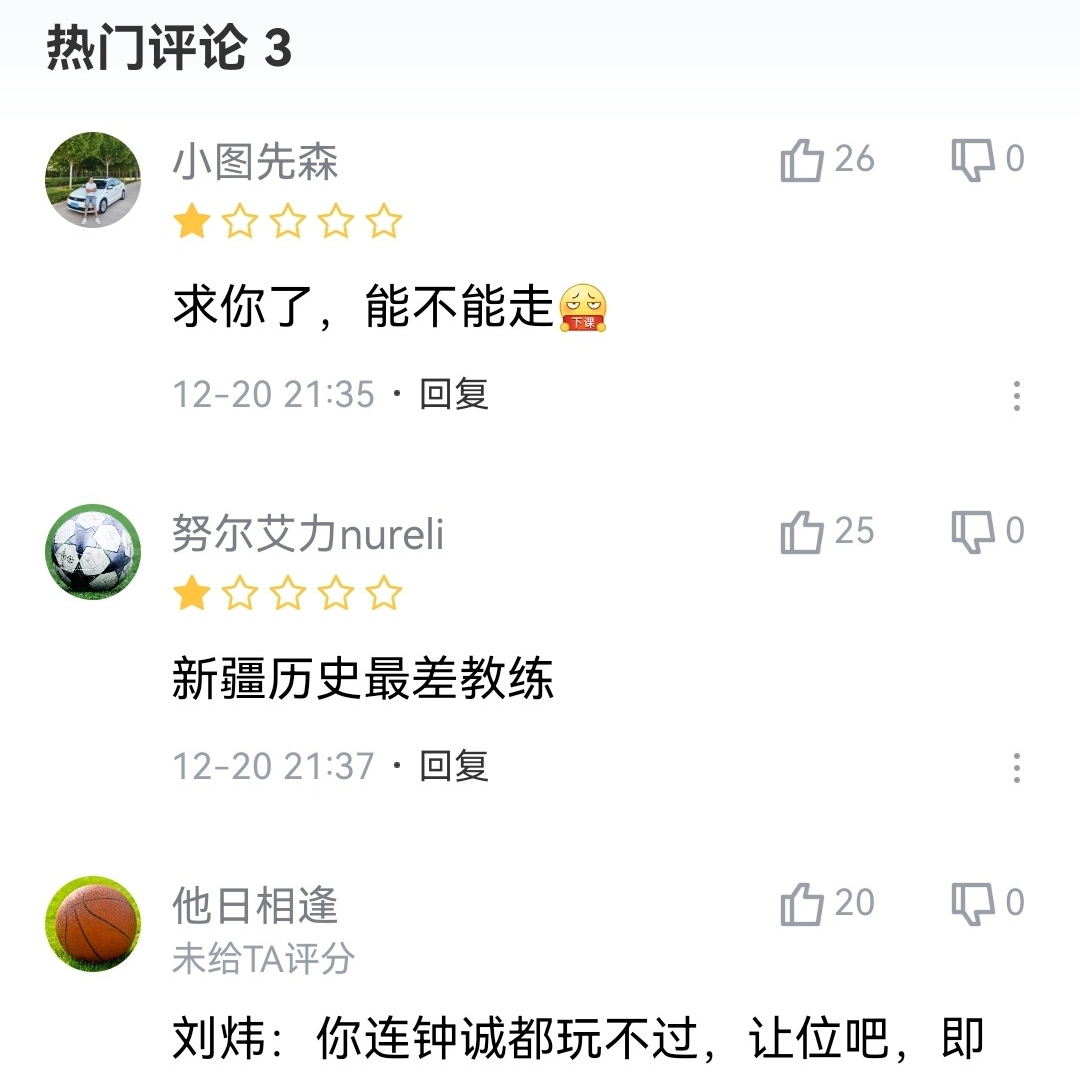 再看球迷评论区,有人评价刘炜是新疆队史最差教练员。甚至网友给出的评分,比丁伟还要低。