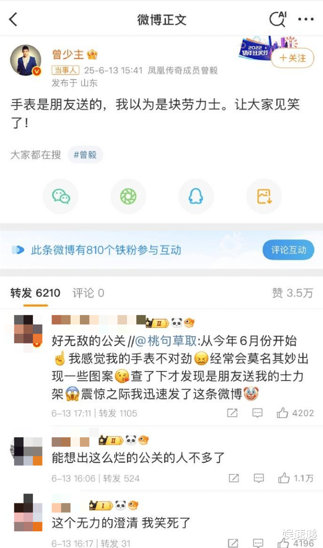 事情发生后,曾毅又上演了一场灾难级公关,他发博表示“手表是朋友送的,我以为是块劳力士,让大家见笑了。”