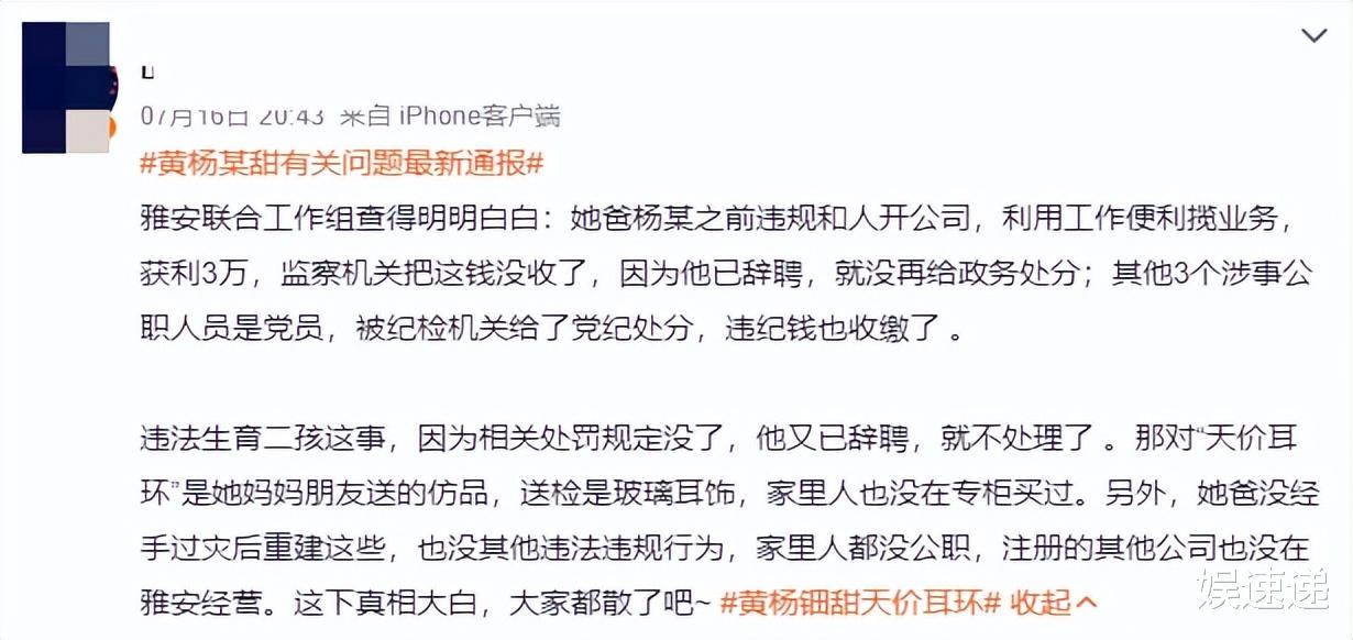 虽然雅安官方介入调查后强调:这副耳环不是价值230万的祖母绿,而是仿制品,暂时平息了网友的怒火。但事态已然开始发酵,黄杨钿甜从父亲的公职背景,到家族企业资金流向等等都被网友“赛博查抄”了一遍。
