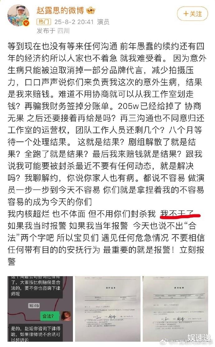 据赵露思披露,公司在她生病期间,擅自从她工作室账户里拿钱,美其名曰是拿去赔偿赵露思因病而取消的代言和剧组的违约金。
