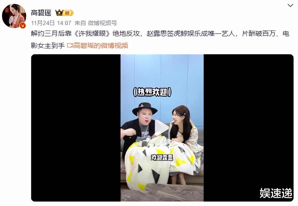 借着舆论的力量,赵露思在11月终于成功解约,新公司虎鲸文娱承担了高额违约金,签约后赵露思成了平台合伙人,获得剧本否决权及股权分红等权益。