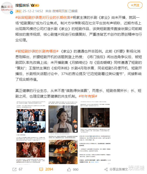 短剧抄袭已然不是头一遭了,对此新词条#短剧抄袭的底线在哪#、#短剧抄袭长剧已严重危害创作环境#诞生,大众纷纷进入到了讨论当中。