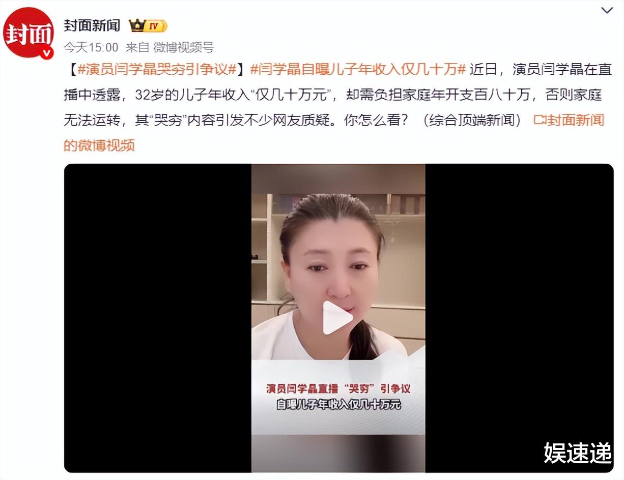 12月29号,闫学晶在直播中诉苦自己32岁的儿子年收入仅有几十万,无法负担整个家庭每年百八十万的开支。