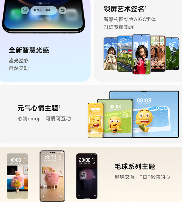 在视觉设计上,全新的智慧光感通过流动光效,挖掘界面中的自然光影美学;全新元气心情主题支持可点击、可触碰的交互方式,带来更具情绪价值的体验;此外,用户还能在锁屏界面借助AI进行个性化创作,定制兼具个性与趣味的专属艺术锁屏。值得一提的是,新增智感握姿功能,当手机来电之后,接听键会由手机自动识别显示在左边或者右边,对应握持手机时大拇指所在的位置,方便用户接听或拒接。