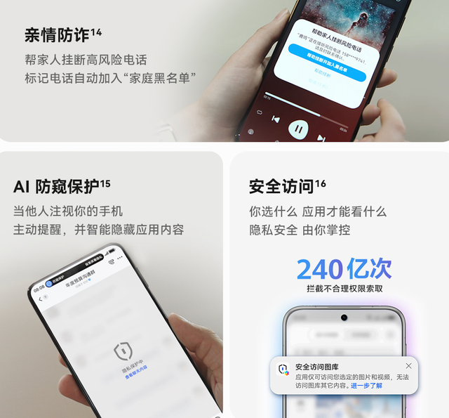 升级HarmonyOS 6后,华为Mate 70 Air在安全、互联、视觉等方面均实现显著提升。安全层面,全新的安全访问机制已完成99%的鸿蒙应用适配,累计拦截不合理权限索取超240亿次;全新的亲情防诈功能,可在家人接到高风险电话时向用户手机发送提醒,并支持远程挂断,有效守护家人的财产安全。