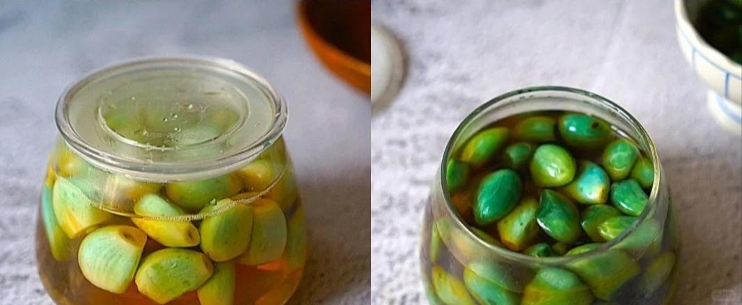 5、我给大家看看我做的腊八蒜。这是放了一夜的蒜头,颜色已经开始有点变化了,能看出和刚放进去的时候不一样了。再看看腌制了四天的蒜头,哇塞!绿得发亮,真的跟翡翠似的,太好看了。