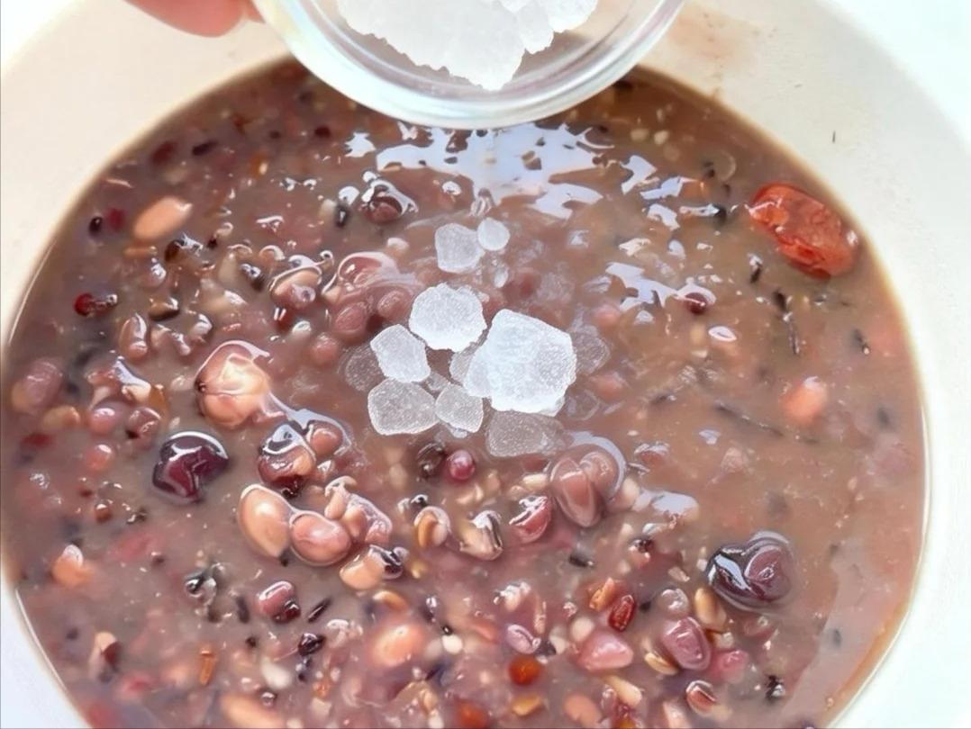 3、40 分钟一到,咱打开锅盖,把准备好的 25 克冰糖放进去,然后盖上盖子再闷一会儿,让冰糖充分融化,和粥完美融合。