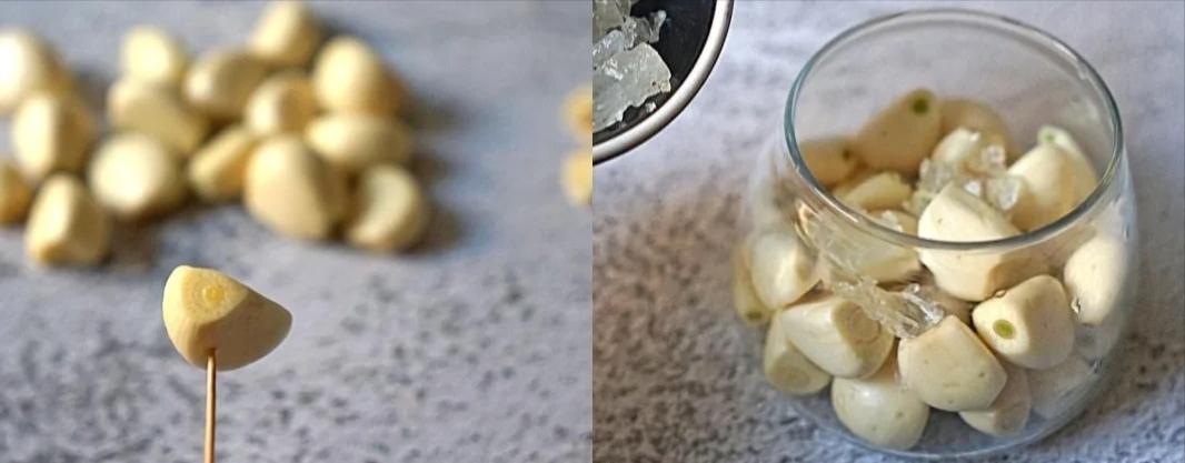 3、找个玻璃器皿,用开水消消毒,把处理好的大蒜头放进去,再扔几块冰糖进去。然后,把米醋倒进去,记住了,米醋一定要没过蒜头,不然蒜头可泡不透。