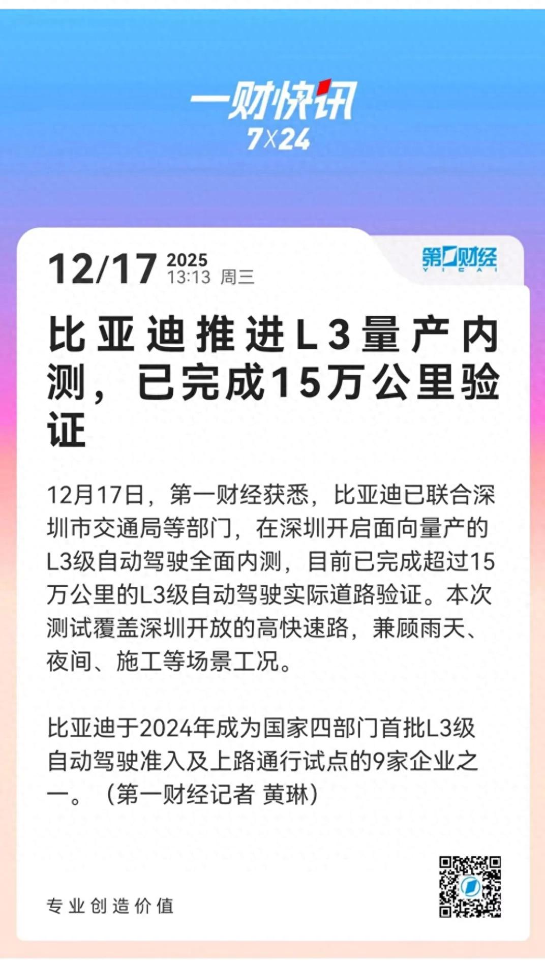 好消息,比亚迪L3级自动驾驶正式迎来量产落地的关键里程碑。