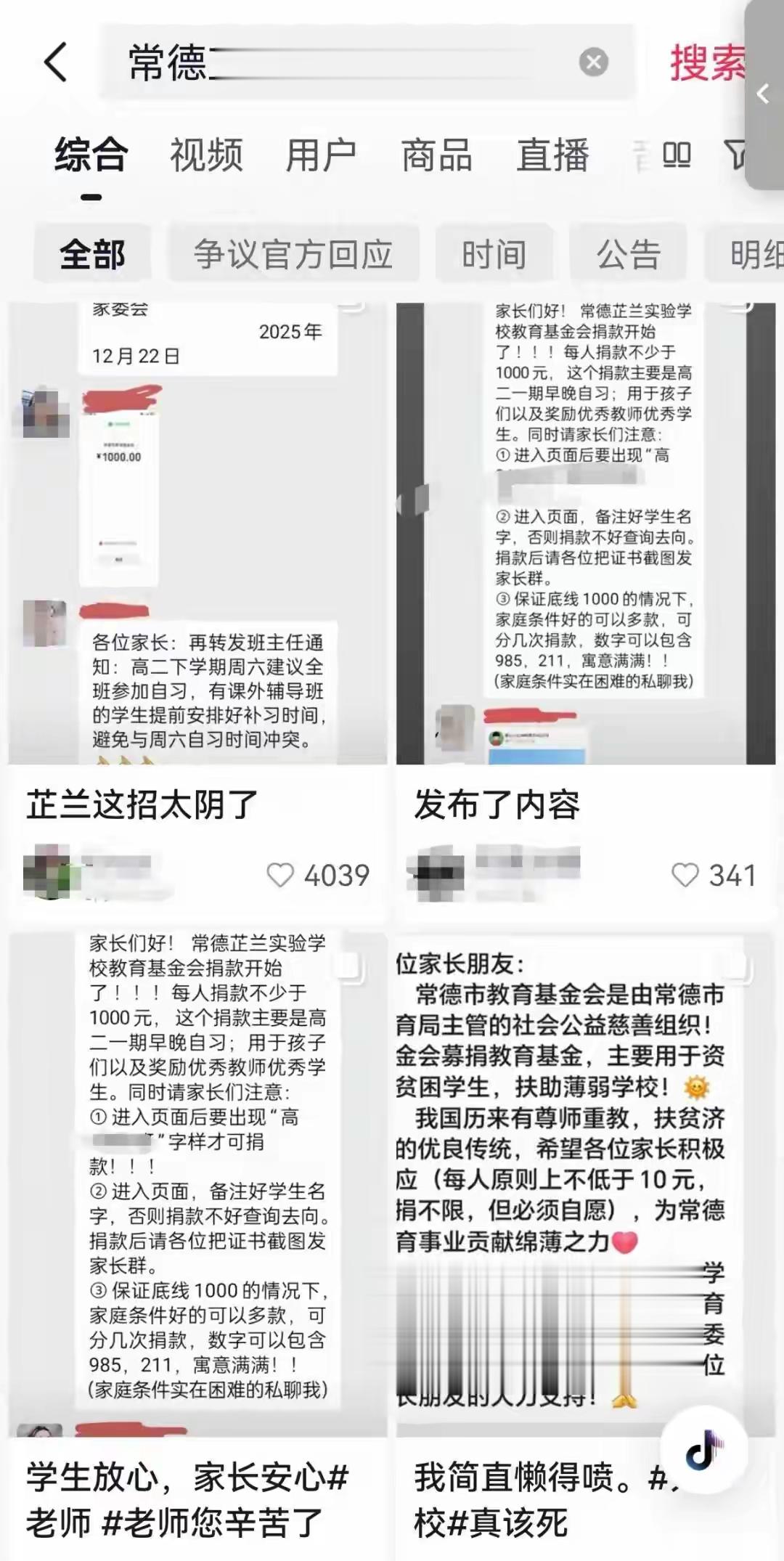有学生家长把募捐这个事情发到了网上,引起了常德市教育局的重视,表示募捐是常德市教育基金会开展的,宣传中理解错了,是自愿原则,设定金额了,所以“好心办错事”了,要停止募捐,对相关责任人处罚。