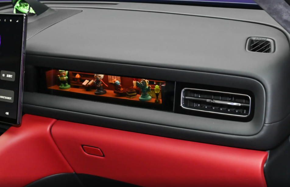 内饰设计同样是对家族设计语言的沿袭,撞色内饰营造了一个温馨舒适的乘车环境,除了常规中控屏和仪表盘以外,这次官方还加入了“灵感橱窗”,位于副驾驶正前方的中控面板,不知道的还以为是娱乐屏。单从外观来看,该屏幕就像是一块普通装饰板,实际上不然,当大家通过中控屏打开设置功能,将副驾橱窗灯效打开,瞬间就像是打开了一个新世界。里面可以摆放用户喜欢的手办,搭建一个小场景,这点确实比较讨年轻人喜欢,只不过很多人对这一设计的安全性能提出了质疑。