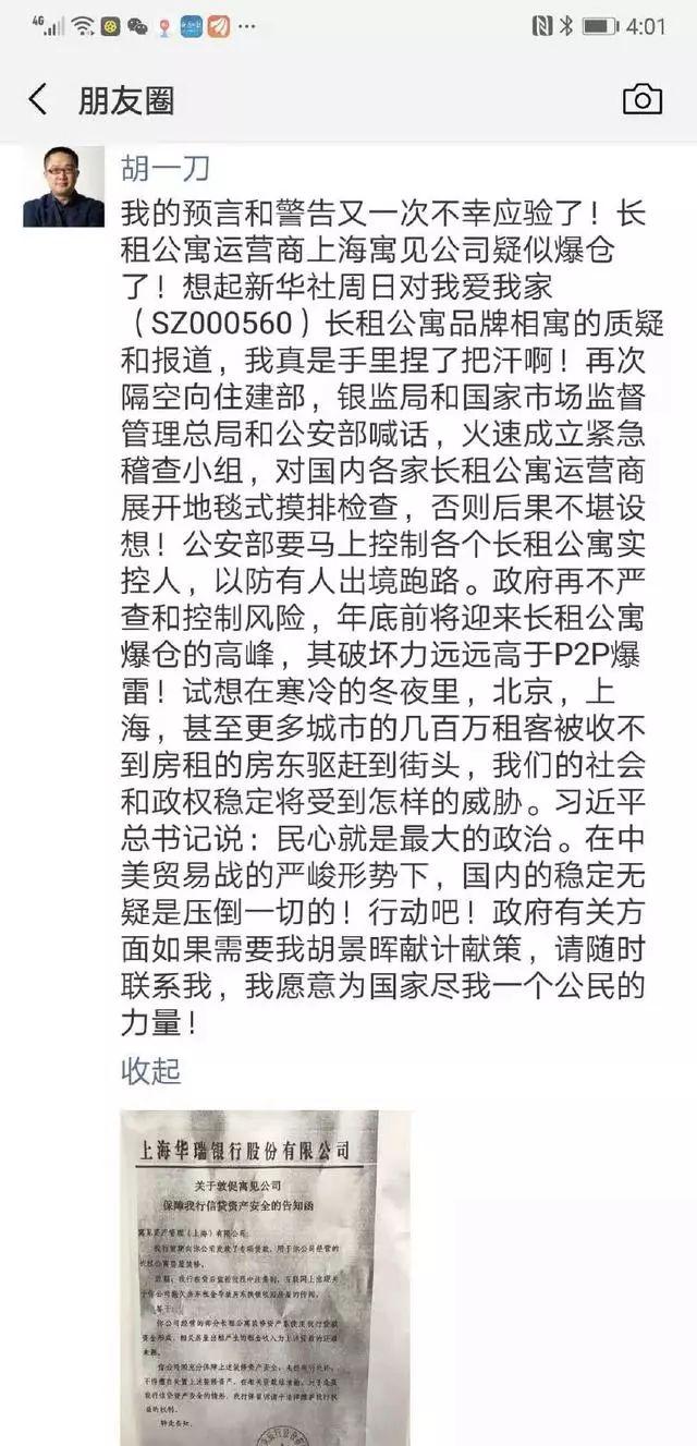 随着长租公寓事件的急速发酵,创业黑马董事长牛文文在朋友圈中发文称,“一个行当,如果过度金融化、过度放杠杆,必然会造成金融风险和社会风险,最后毁灭整个行业”。他表示房屋租赁中介看似不起眼,但如把房主和租房人不够高的信用经由金融工具放大N倍,并不断加杠杆融资,那谁也不知道一旦爆雷金融风险会传导波及到什么领域、什么程度。