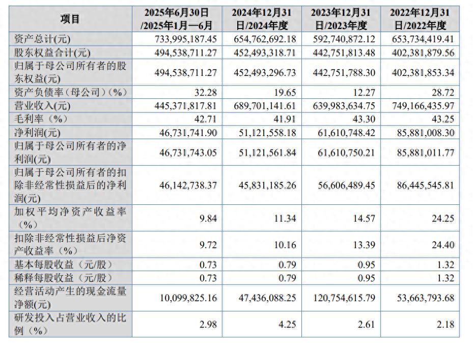 报告期内(2022年至2025年上半年),国贵科技的营业收入分别为7.49亿元、6.4亿元、6.9亿元、4.45亿元;净利润分别为8588.1万元、6161.07万元、5112.16万元、4673.17万元。