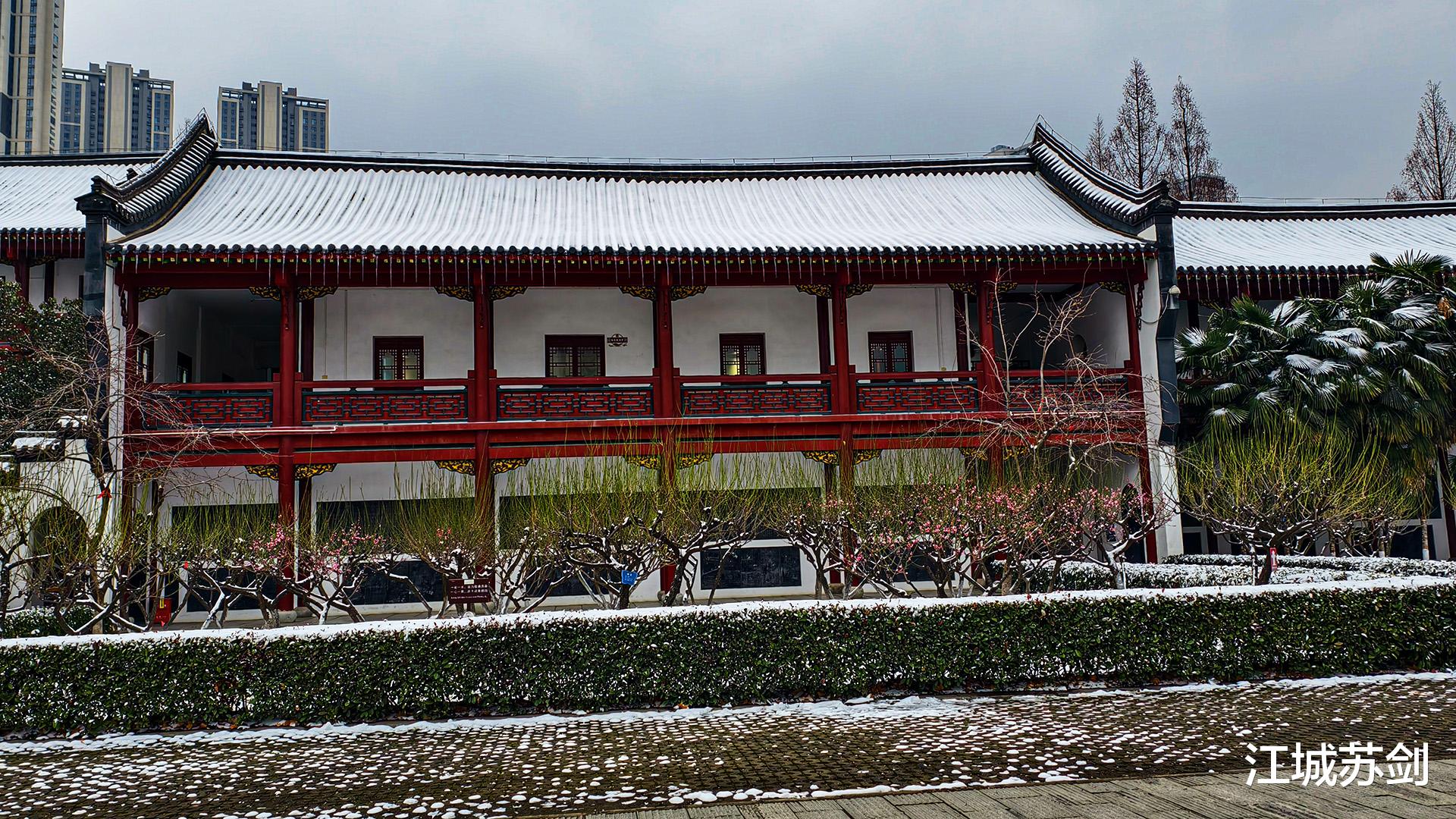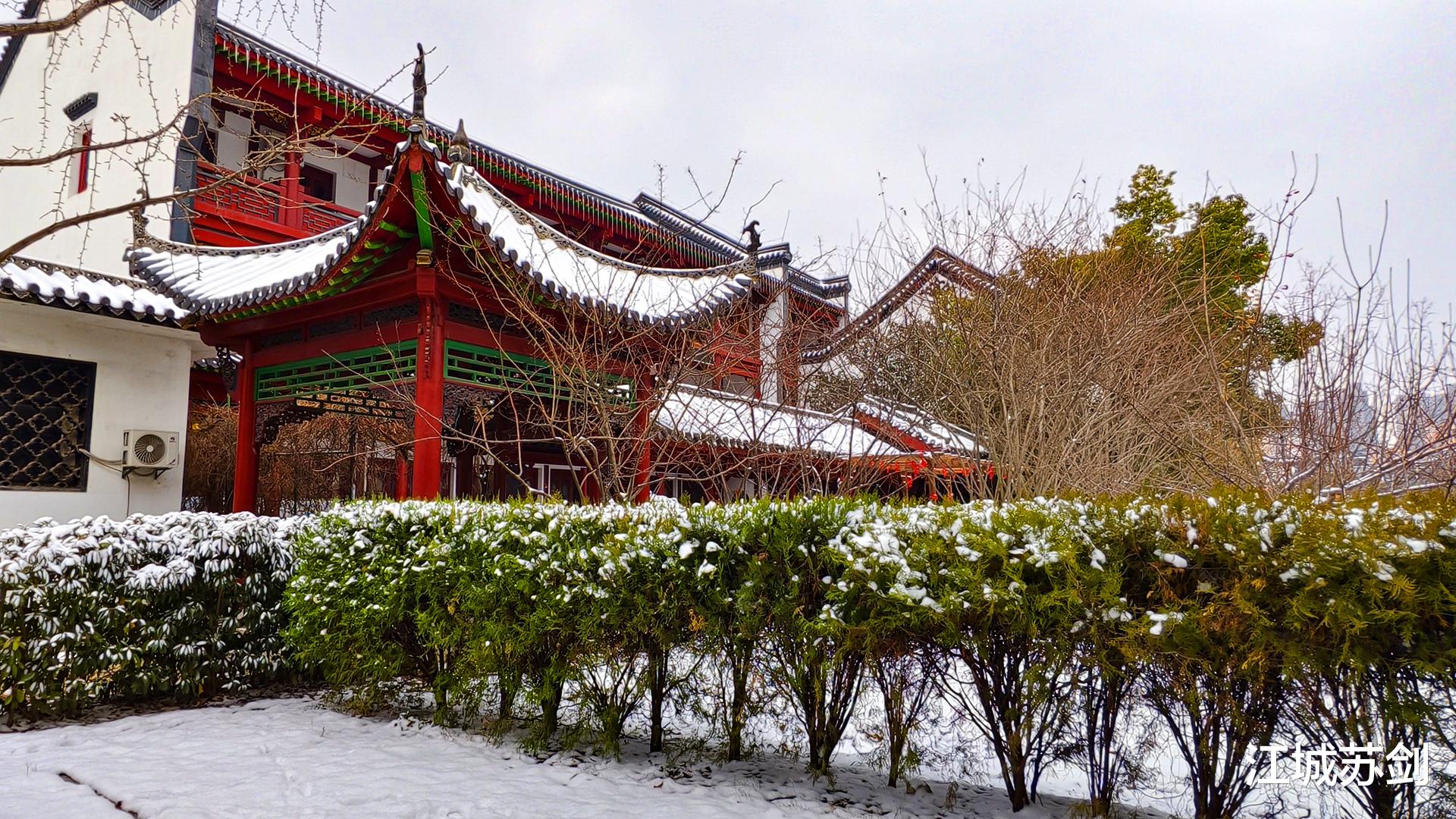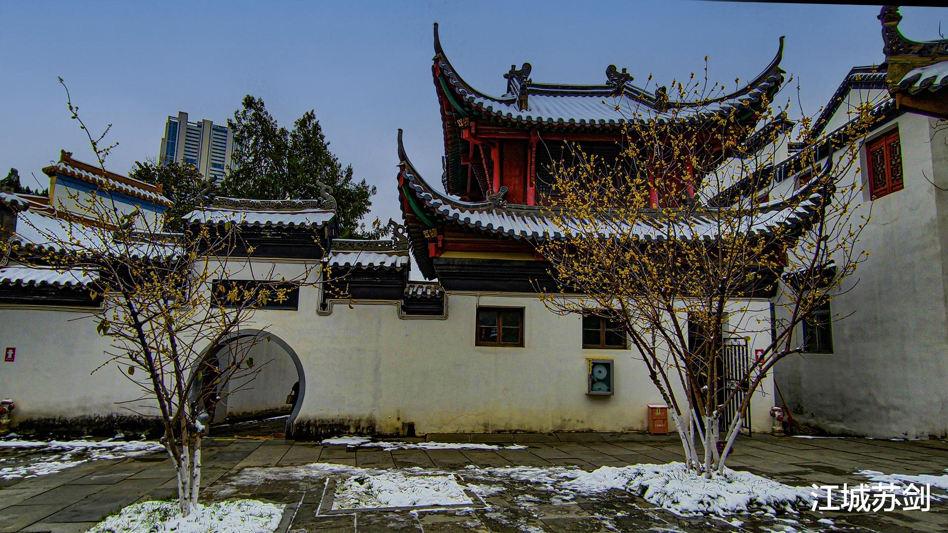 漫步至藏经阁,腊梅暗香浮动。数枝红梅破寒而开,与飞檐翘角、朱红廊柱相映成趣,为素净冬日添上一抹灵动。偶有鸽群掠过黛瓦,翅声划破古刹宁静,又归于更深的清幽。