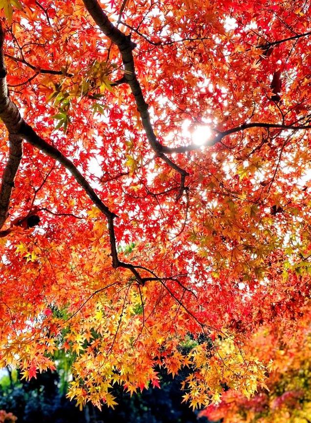 秋冬之际鲁园中,枫叶流丹似火红。霜落寒枝添雅韵,风吹小径意无穷。冬赏秋景,红叶美于二月花。上海鲁迅公园的秋景已达高光期,