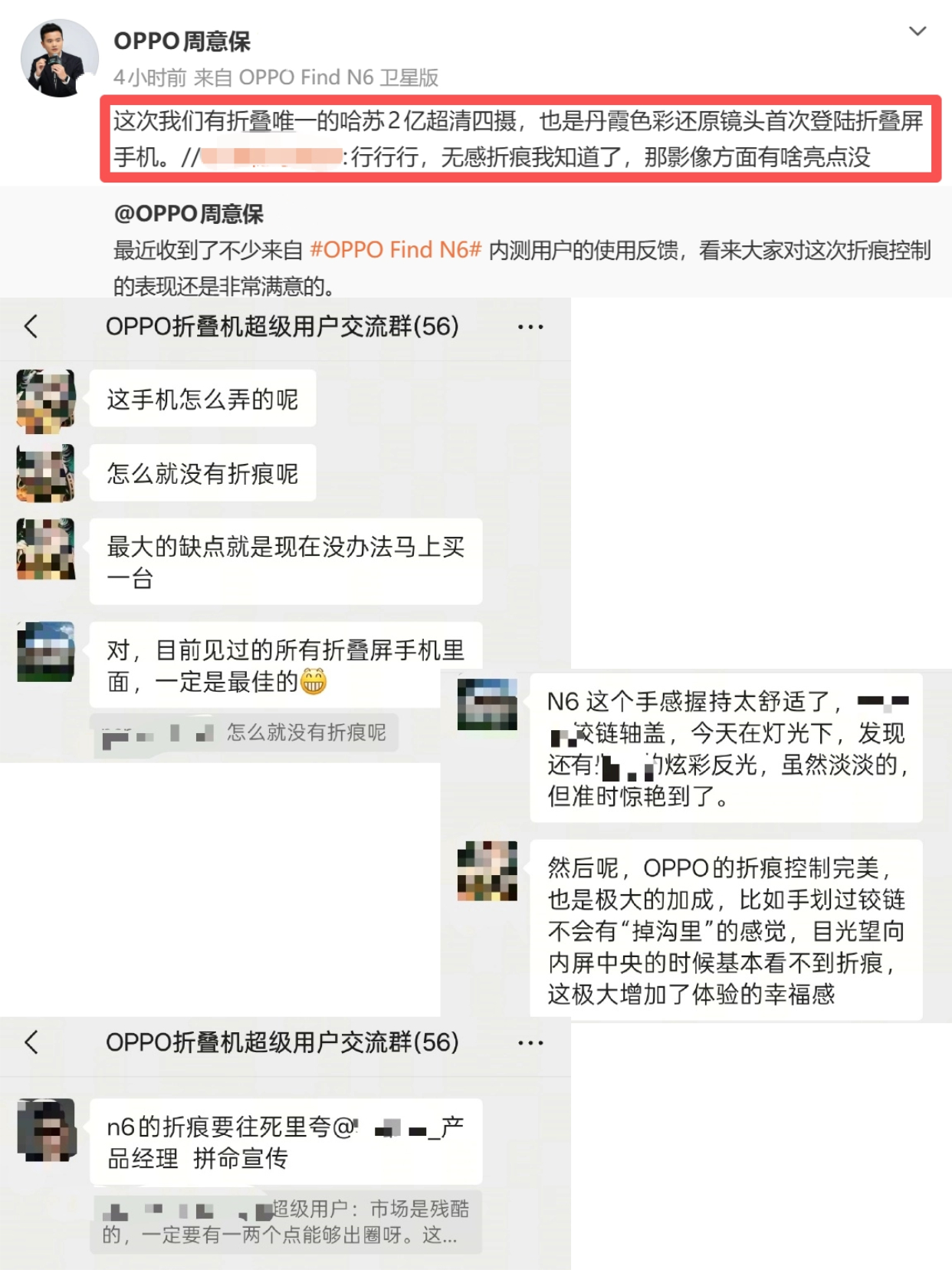 之前有爆料提到,OPPO是用了无痕钛合金铰链+自修复记忆玻璃两项黑科技,通过了莱茵测试,内屏平整度放眼全球也是TOP级的。看OPPO周意保的分享,提前用上Find N6的用户对它的折痕非常满意,都在群里刷屏了!