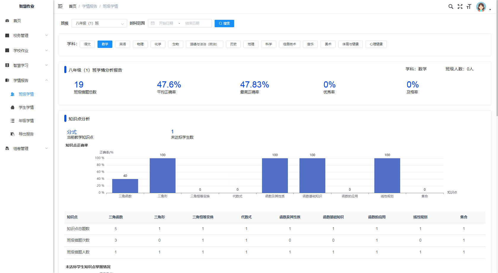 AI系统并非简单“判分工具”,而是学情分析的智能载体。其可自动统计班级错题率、学生个体错误类型,生成“班级学情雷达图”“学生错题本”等数据产品: