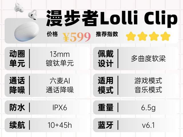 这款耳机单耳仅 4g,轻量化设计搭配 0.6mm 记忆柔丝与人体工学结构,能精准适配各类耳型,还能均匀分散耳部压力。耳夹处的高弹硅胶包裹带来亲肤触感,实现久戴无勒痕、不夹耳,即便运动佩戴也能牢牢固定不脱落。音质表现则中规中矩:全景音增强技术搭配 10mm 动圈喇叭,让低频有力度、节奏感在线,但整体声音的通透度稍显欠缺,解析力也有待提升。
