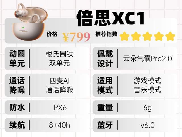 倍思 XC1 配备云朵气囊 Pro2.0 结构,搭配亲肤硅胶材质,单耳仅 6g,佩戴轻盈近乎无感,长时间佩戴也没有明显压迫感,舒适度十分出色。不过稳固性表现一般,日常通勤使用没问题,但剧烈运动时会出现轻微晃动,需要调整才能保持稳定。 音质是 XC1 的核心优势,它采用楼氏圈铁双单元,经过 Bose 专业调音,还获得 Hi-Res 金标认证,支持 LDAC 高清编码与杜比音效。高频通透细腻,人声清晰自然,低频下潜扎实有弹性,声场宽广,细节还原到位。
