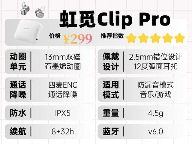 这款虹觅Clip Pro佩戴起来基本没什么存在感,也不会有夹耳的感觉,而且前高后低的2.5mm错位设计搭配电池仓12度弧面耳托,能更好的贴合耳背,进一步提升贴合度与舒适度。动圈选用双磁喇叭,靠两款高精度叠加磁铁配合强磁场,进一步提升音质与音量;还采用气旋式引擎腔体技术,打造圆柱形铝合金金属腔体,承载更多气流量以提高声音推力,带来更澎湃的重低音。配合上石墨烯科技振膜的高形变能力,和虹觅声学实验室的专业调音,能确保整体音质稳定不失真,细节更饱满,可以说是五百价位音质最好的耳夹式耳机!而且这款虹觅Clip Pro还支持自研的防漏音模式,开启后能发出反相声波,大幅降低泄露的声音,在图书馆、宿舍等一些安静环境下使用也不怕,整体配置也在线。