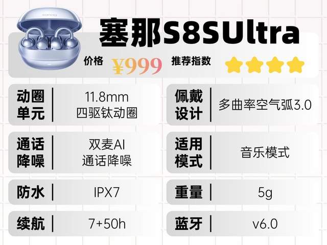 塞那 S8S Ultra 采用多曲率空气弧 3.0 人体工学结构,搭配记忆钛丝与亲肤硅胶,单耳仅 5g,佩戴轻盈无负担。耳机能很好贴合耳廓曲线,舒适度表现不错,长时间佩戴也不容易胀痛,只是大幅度跑动时会出现轻微移位。它搭载 11.8mm 四驱钛动圈单元,配合双专利声学算法与 APE 全景音增强技术,中高频解析清晰,人声自然通透,声场开阔且富有层次感。不过低频表现普通,氛围感偏弱,更适合人声、轻音乐、流行等日常听歌风格。