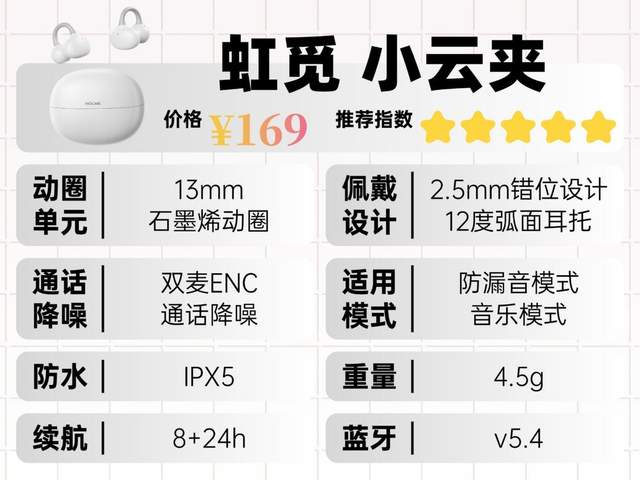 虹觅小云夹在佩戴上玩出了新花样,2.5mm 前高后低的错位设计贴合耳道自然结构,戴上去稳稳当当不晃动;电池仓的 12° 弧面耳托还能托住耳背分散压力,久戴无负担。更绝的是它 4.5g 的单只重量,轻到几乎让人忘记佩戴,连续三四个小时也毫无夹耳感。音质上,石墨烯动圈单元凭借优秀的形变能力,让声音细节清晰可辨,听感真实细腻。自研防漏音模式一键解决外放尴尬,地铁、办公室使用都很合适;HBC 智能双联功能还能让一副耳机拆成两幅单独用。论佩戴舒适度、音质表现和实用性能,它都是百元档耳夹式耳机里的天花板!