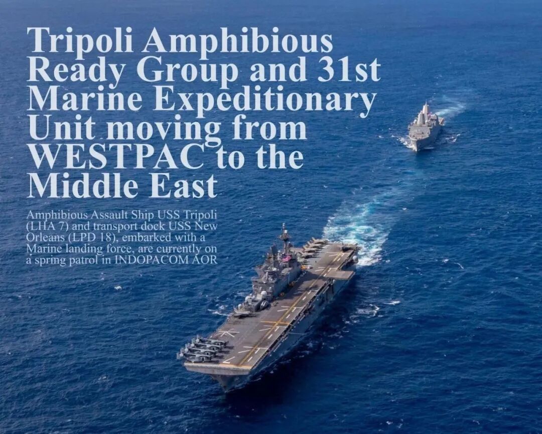 美国国防部已从日本调派“的黎波里”号两栖攻击舰运载美军第31海军陆战队远征队前往中东地区。