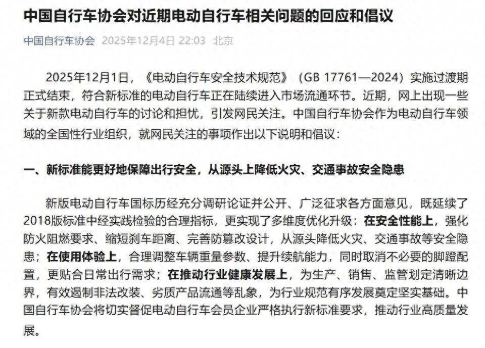 12月4日晚,中国自行车协会发文称,2025年12月1日,《电动自行车安全技术规范》(GB 17761—2024)实施过渡期正式结束,符合新标准的电动自行车正在陆续进入市场流通环节。近期,网上出现一些关于新款电动自行车的讨论和担忧,引发网民关注。中国自行车协会作为电动自行车领域的全国性行业组织,就网民关注的事项作出以下说明和倡议:
