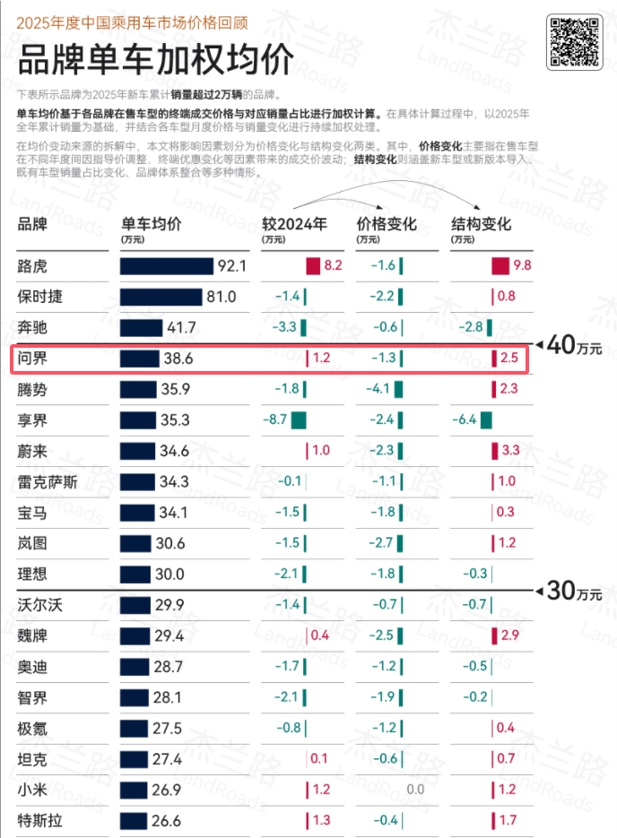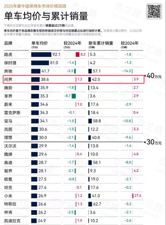 作为一直关注新能源汽车的人,《杰兰路2025年乘用车成交均价与销售额报告》彻底改变了我对国产高端的看法,原来咱们的自主品牌真的能在豪华车市场弯道超车,不用再靠低价抢占市场。报告里最让我有感触的是,问界用数据证明了,不靠低价内卷,靠提升价值也能站稳脚跟,给很多车企指了条明路。现在很多传统豪华品牌,就算降价促销,销量还是往下掉,反而越降越掉价,而问界不跟着凑这个热闹,专心做产品体验,靠跨界融合新模式的优势,打造出不一样的豪华感,最后也得到了大家的认可。38.6万的均价、42万多的年销量,背后全是两大硬支撑:质量上稳坐杰兰路榜单第一,就算一年交付几十万台,品质也没打折扣;口碑更是没话说,用户推荐率特别高,每卖5台车就有2台是老车主推荐的,足以看出大家有多认可。靠着质量和口碑的双重加持,26年开年一个月就登顶新势力销量榜首,卖了四万台。问界品牌在价格体系稳定的基础上,规模同步在不断扩张,真是中国高端新能源汽车的典范。