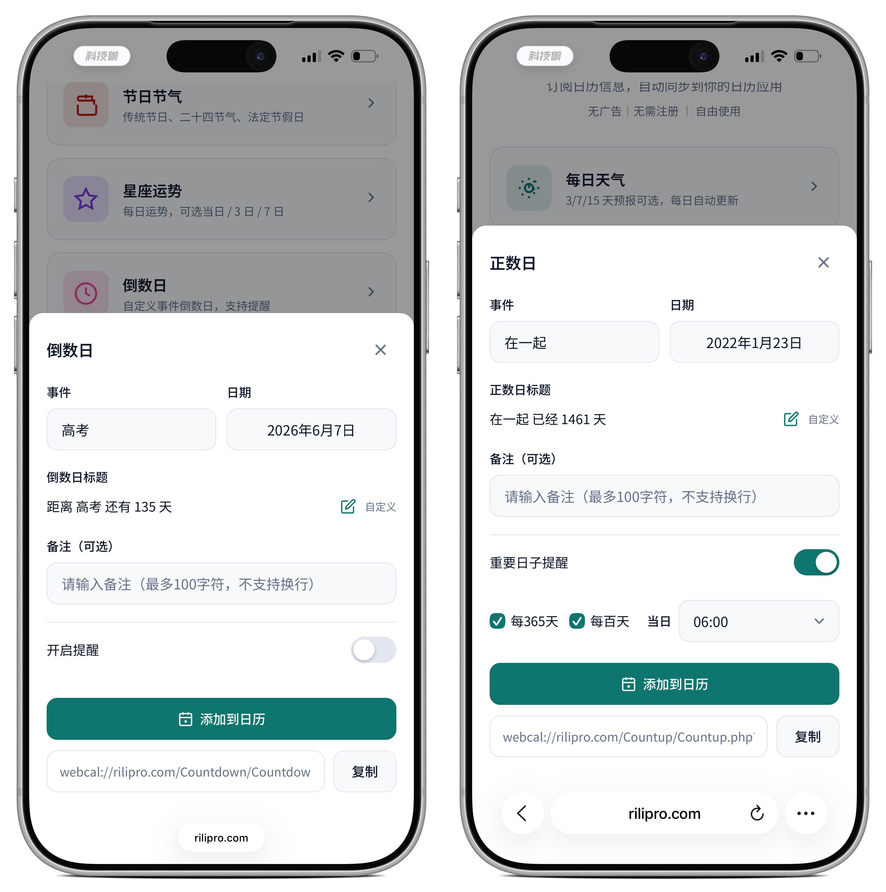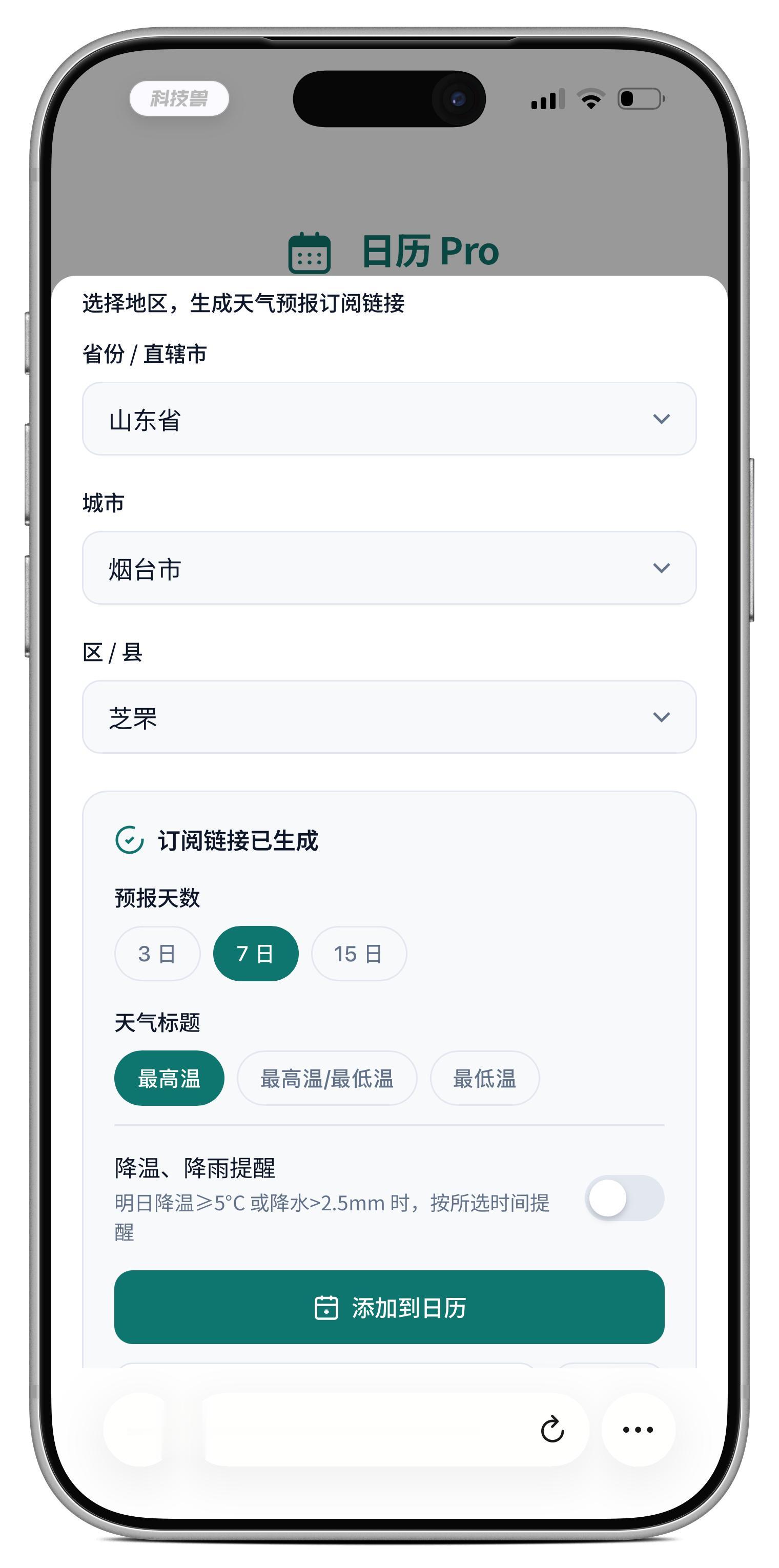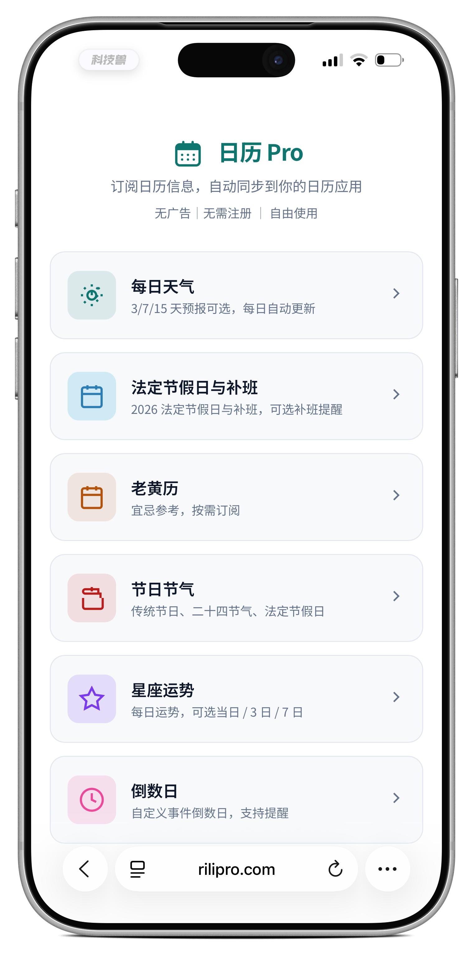 一次性把这些能力补齐,推荐一个「日历 Pro」工具。这是一个专门提供日历订阅服务的网站,无需注册,打开就能用。不仅限于 iPhone,只要你的设备或应用支持(安卓系统、第三方提醒事项、日历 App 等),都可以添加订阅。