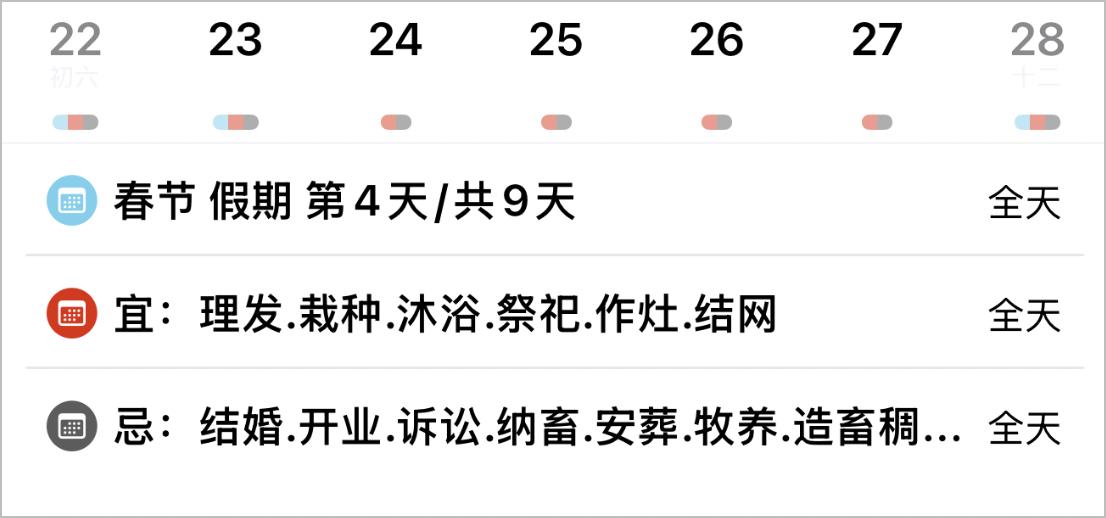 「老黄历」和「节日节气」则属于偏补充性质的内容。老黄历可以显示每天的宜忌信息,可单独订阅或同时订阅,效果如下: