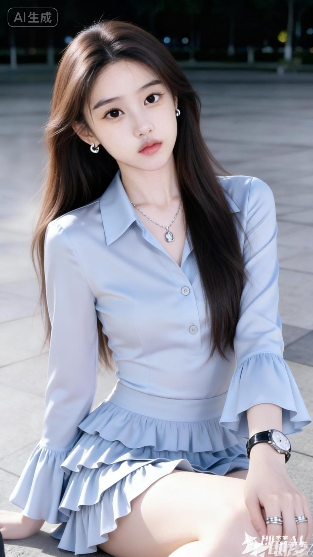 一位长发垂至腰间、漂亮的女生站立着,上身紧身短袖,搭配紧身牛仔裤,有美甲,左手比