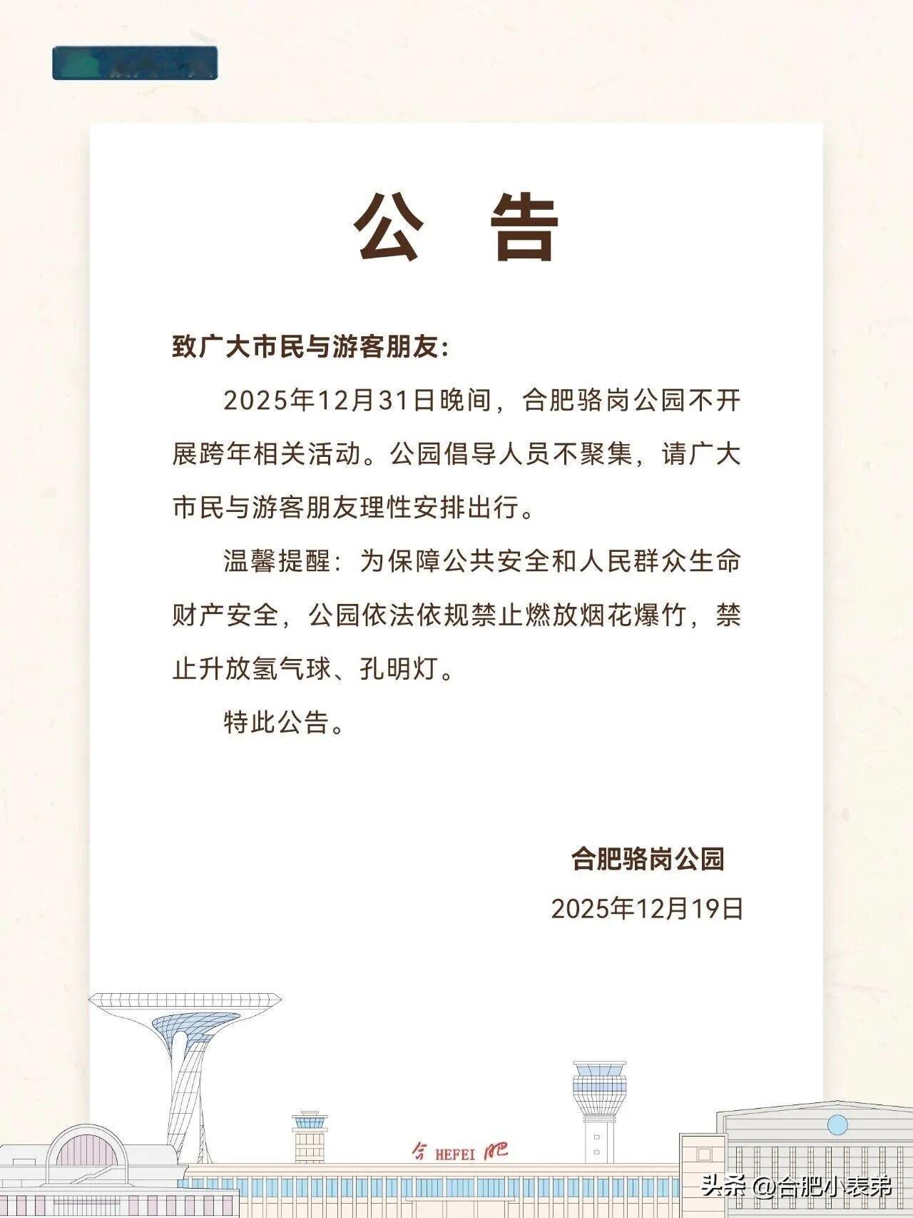 官宣!合肥骆岗公园不开展跨年活动。12月19日,合肥骆岗公园官方发布公告,明确1
