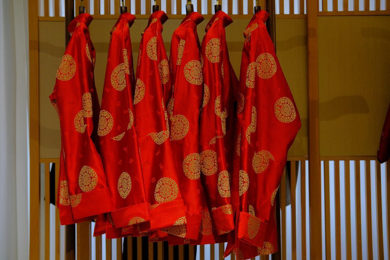 一位女士在服装店里试穿红色旗袍。