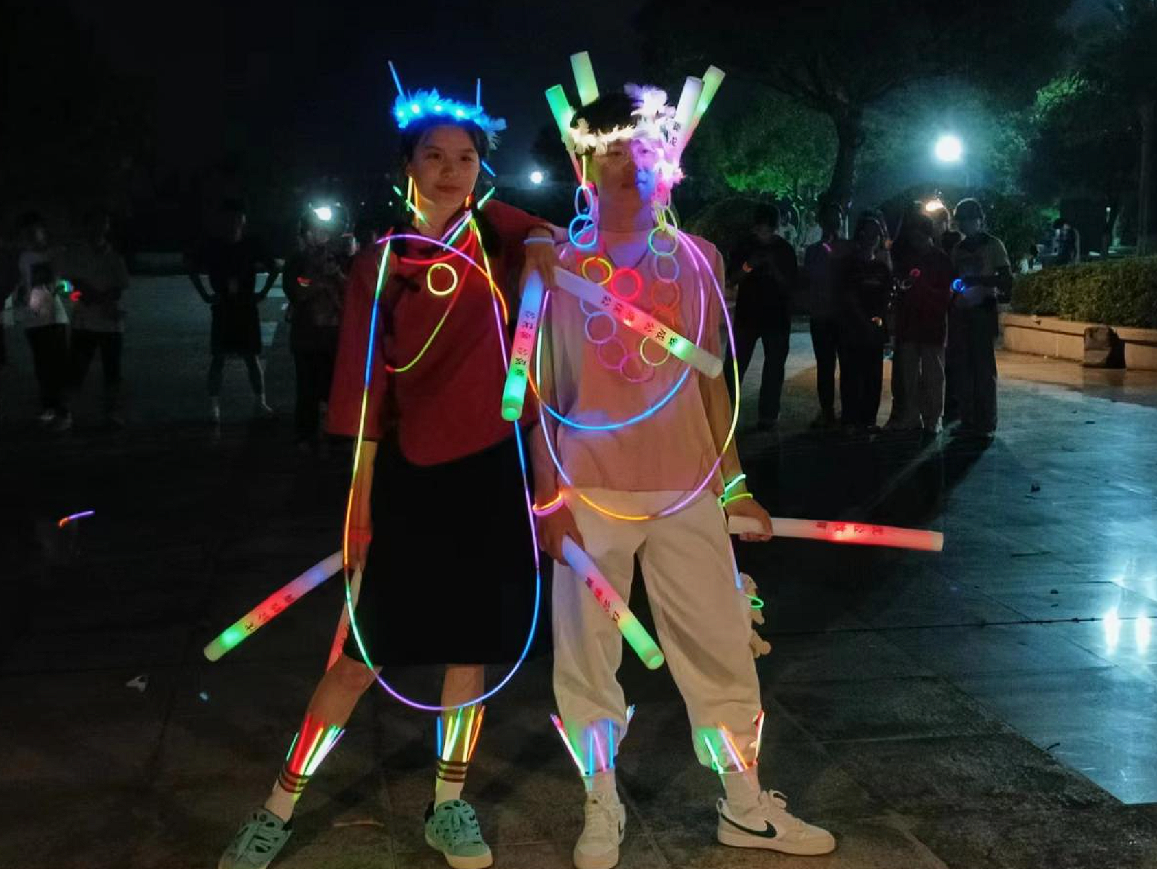活动没有排名之分,没有速度之争,参与者可以自由享受运动的乐趣。沿途设置的荧光装置艺术更是让人目不暇接,有荧光拱门、荧光涂鸦墙、荧光灯柱等,每个转角都有惊喜。最受欢迎的环节是“荧光隧道“,学生们穿过这个由荧光棒组成的隧道时,仿佛置身于科幻电影场景中。