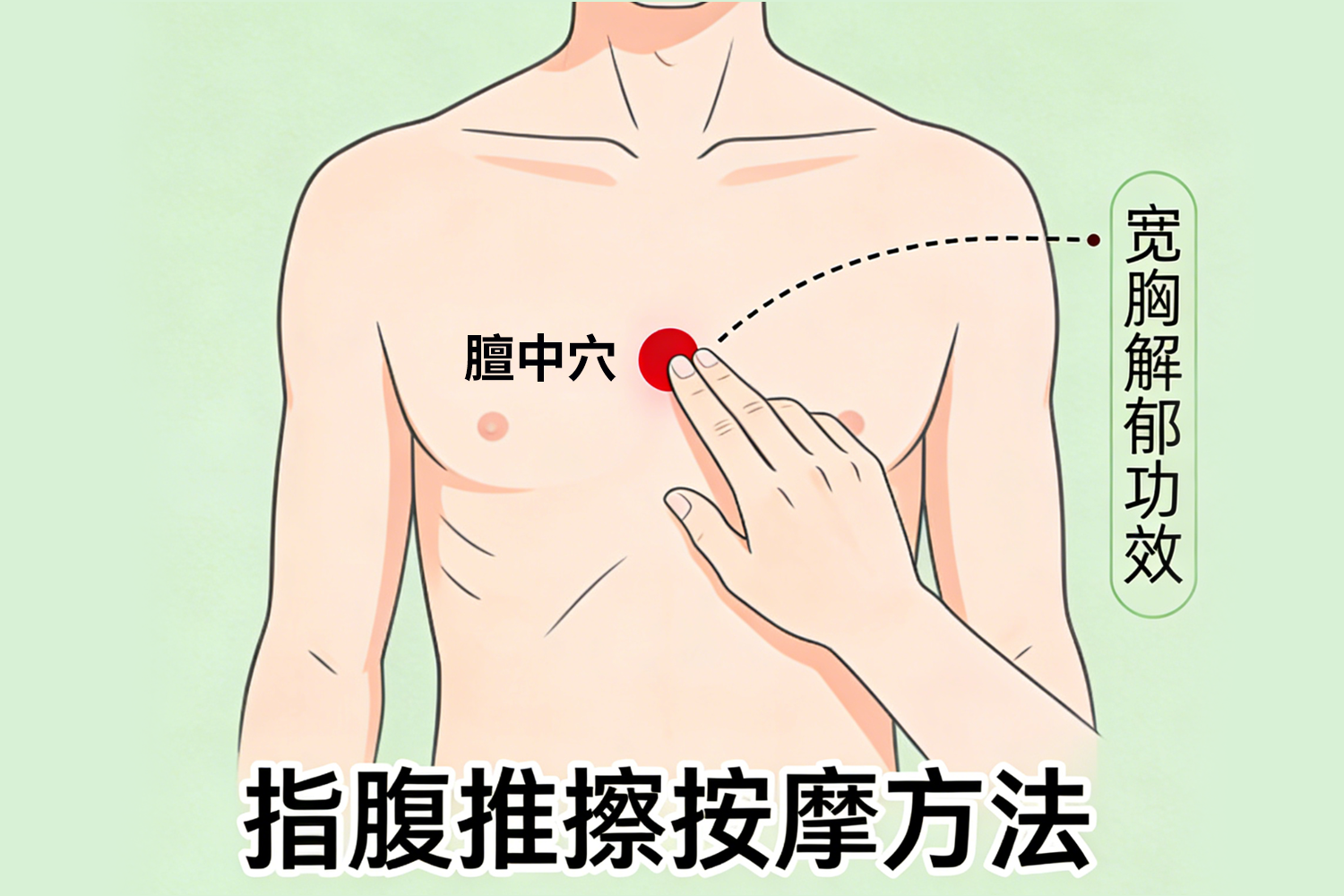方法:用食指、中指、无名指三指指腹,由上向下轻柔推擦膻中穴及周围区域,共30次。