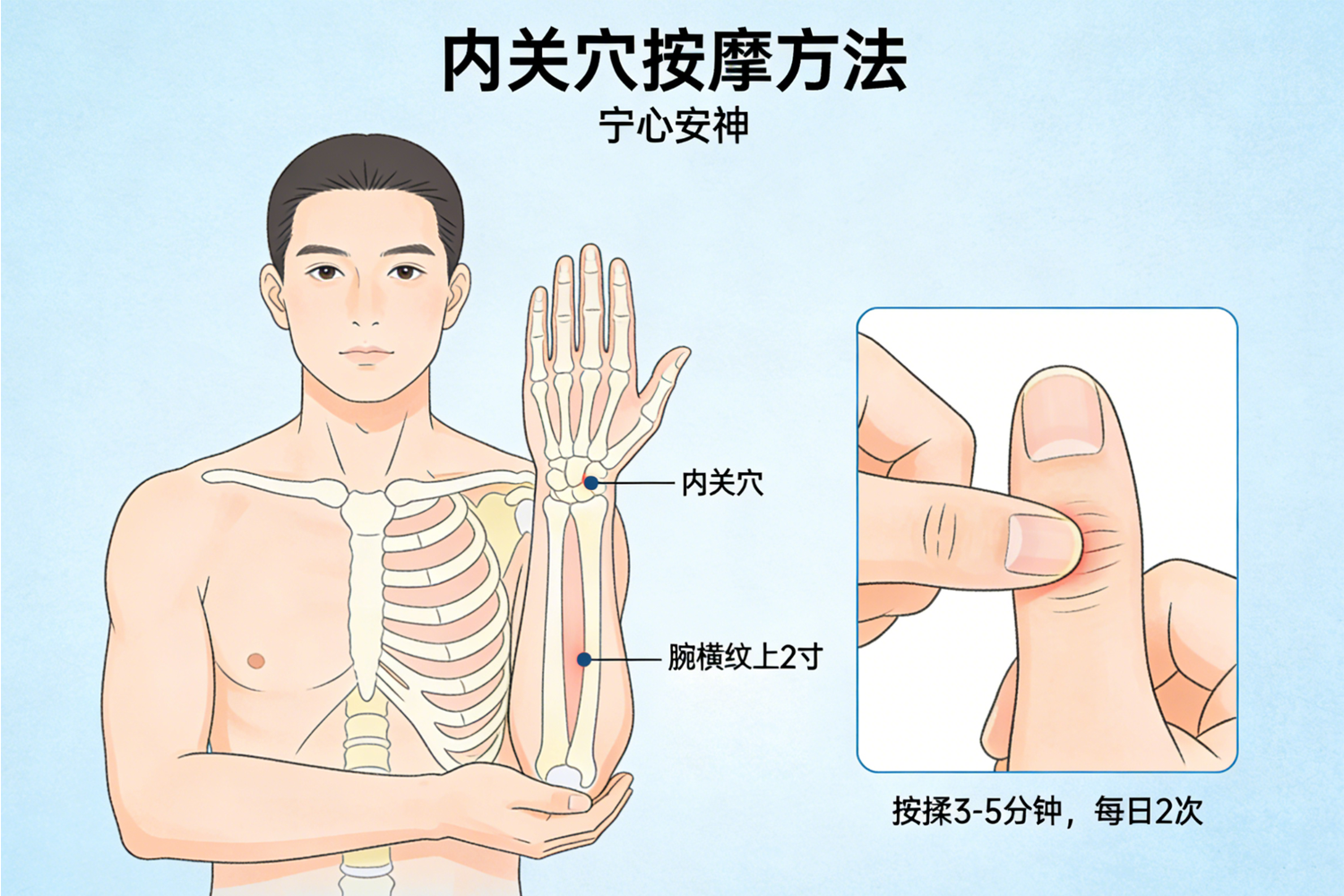 功效:内关为“心包经络穴”,常按可宁心安神、宽胸理气,缓解心悸、胸闷,是强健心气的要穴。