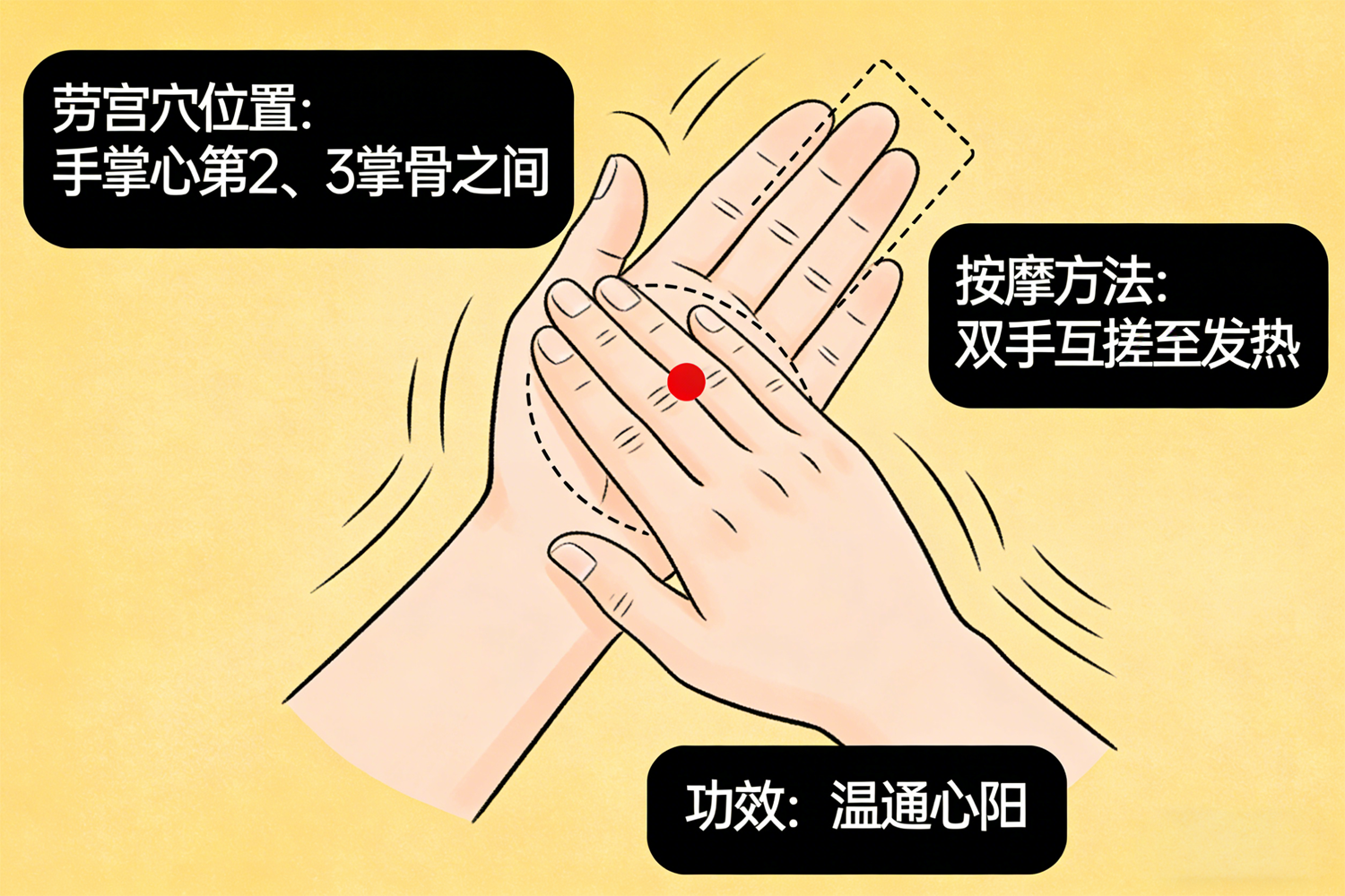 功效:劳宫穴为心包经“荥穴”,手心的快速摩擦可直接激发心经气血,温通心阳,改善手脚冰凉、心神不宁。